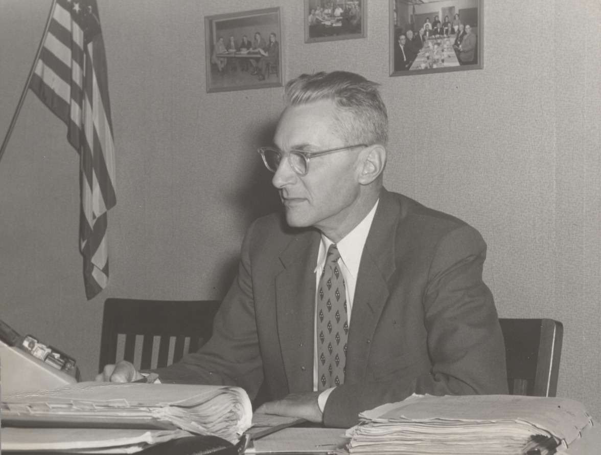 William C. Hobbs at his desk in School Supervisory Union 49 Office.