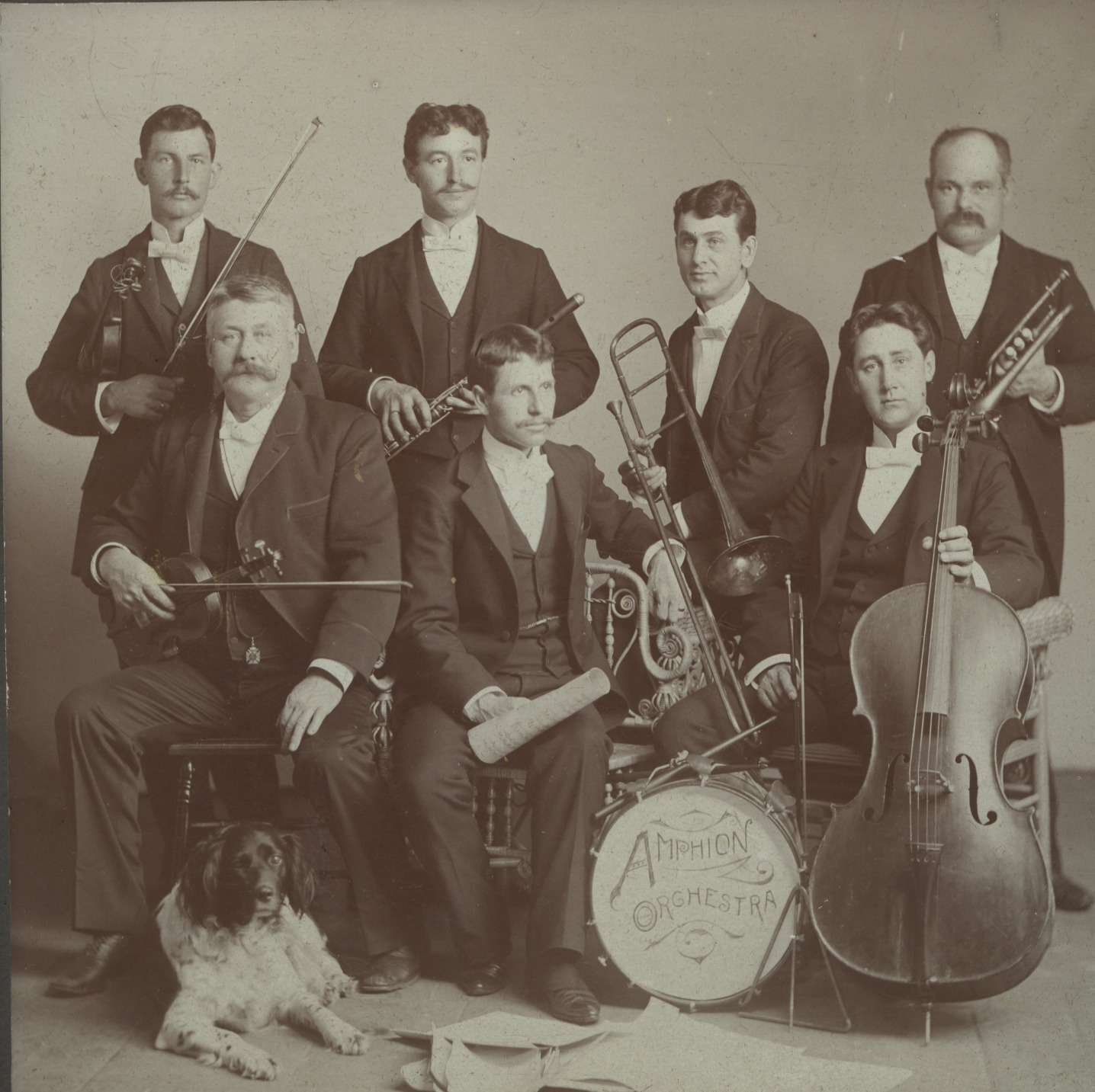 The "Amphion Orchestra, c. 1897, was a local group for hire, led by Clarence Kent, director and music teacher. L-R, front row, Charles Gage, Clarence Kent, Will Tilton. Back row, J. Frank Goodwin, Arthur H. Copp, Van Morrill, Fred Hersey.