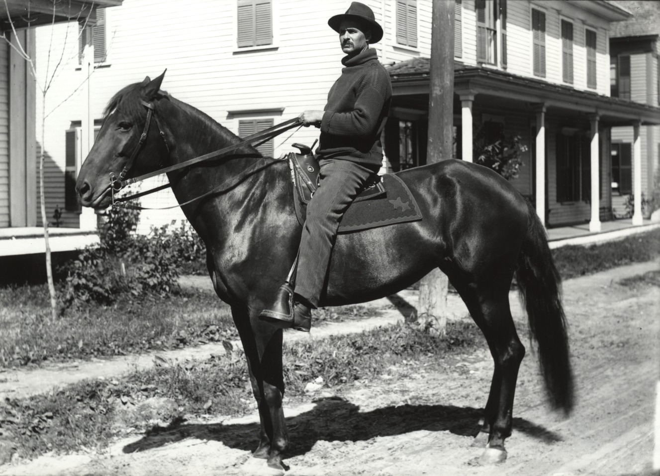 Fred Mayhew on horseback. He was an engineer at the first electric light plant at Clow's Mill.