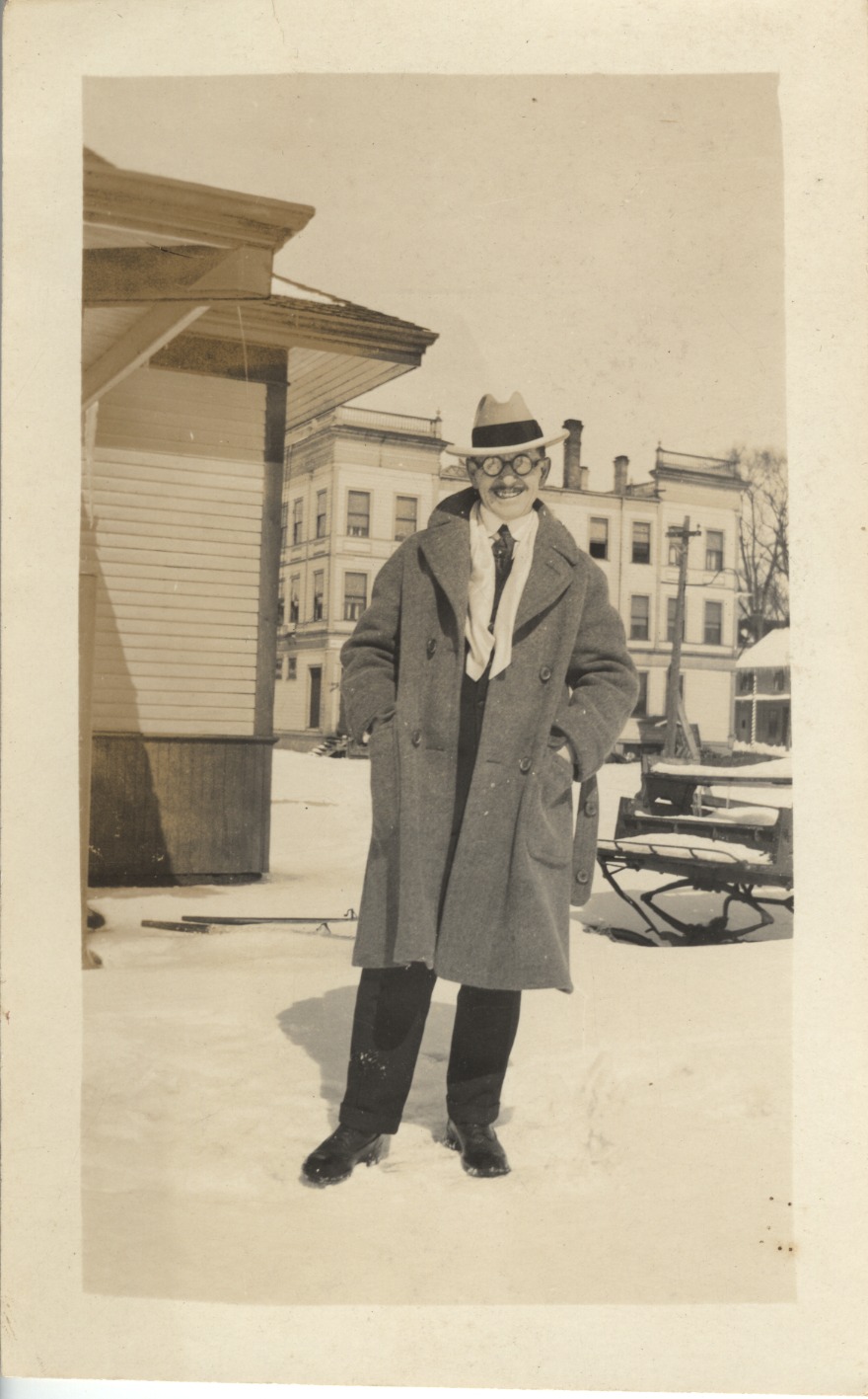 Clarence Edward Kent, music teacher. He had a studio in the Peavey Block, now known as the Avery Block. He was also an organist at the First Christian Church on North Main St. He is standing in the Dockside area with the Peavey Block in the background.