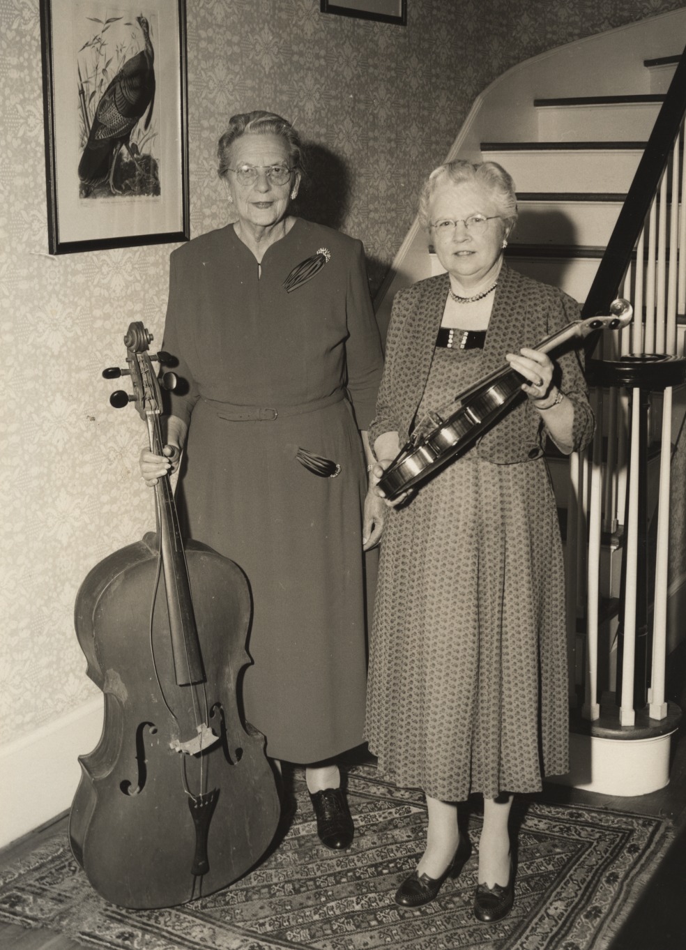 Left is Grace Paris. Right is Wilma M. Paine, Wolfeboro Librarian 1943-1966. The violin was made by Smith Paine, her father. Photo taken in Cobham Hall. Miss Paine was born 2/22/1901, died 11/15/1985, lived in Pleasant Valley in the old Moses Thompson, Simon Fogg house.