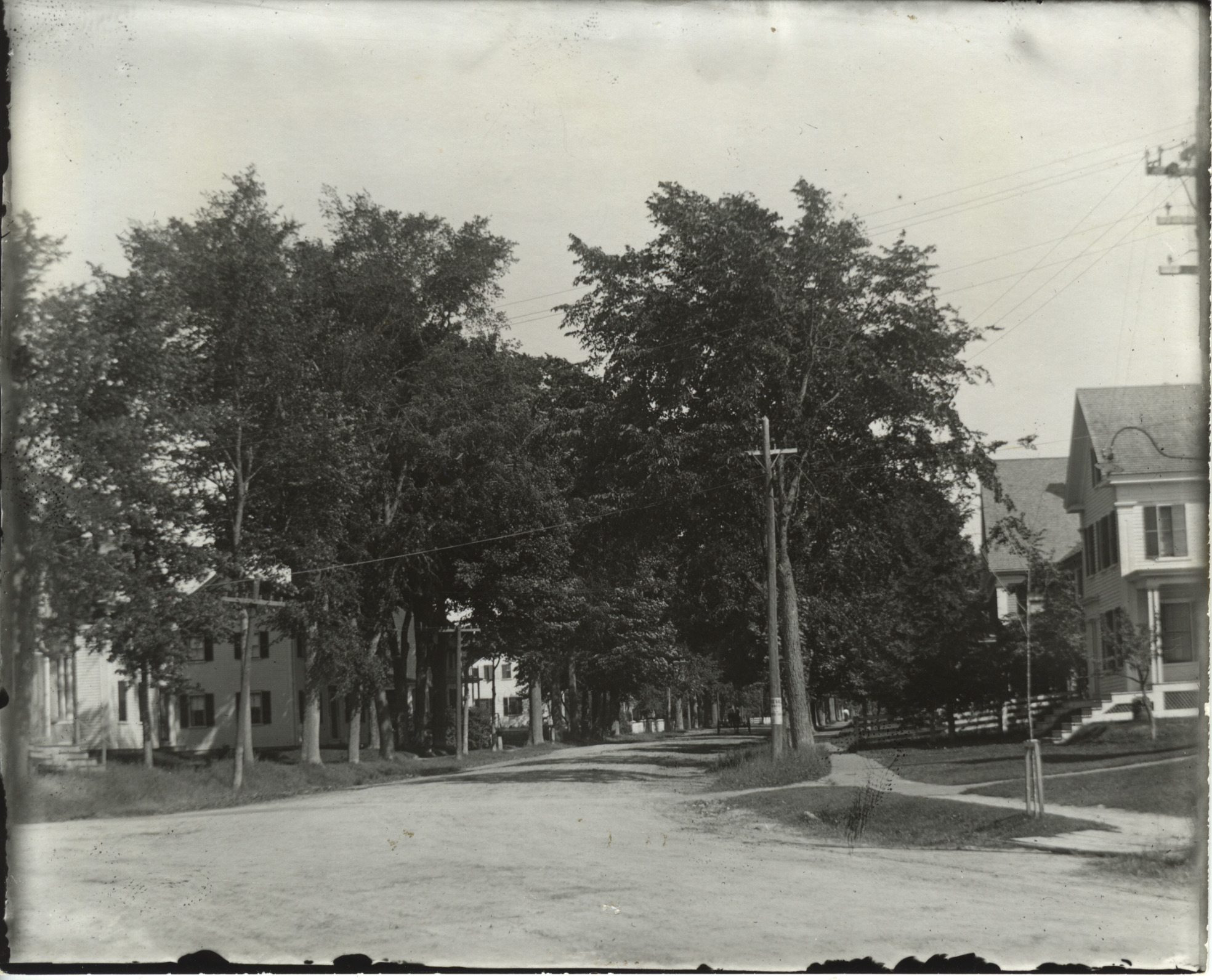 South Main St. looking southeast from Pickering Corner. First house on right is Sanborn House. Second house on right is the Francis B. Cook House, torn down c. 1930, owned by Brewster Academy. C. 1899.