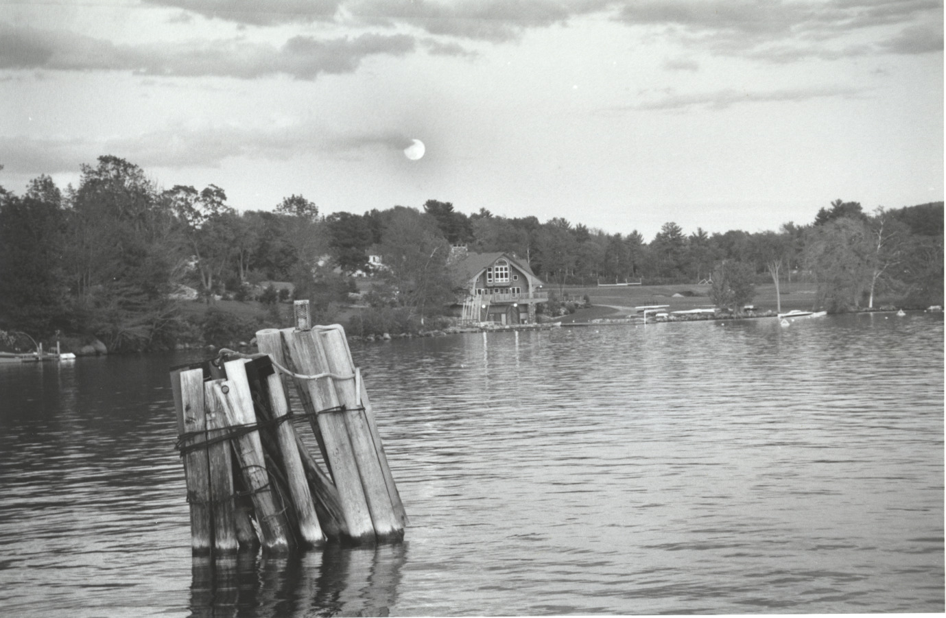Moonrise over Brewster Academy's Pinckney Boathouse. Taken from Dockside area, June 3, 1993.