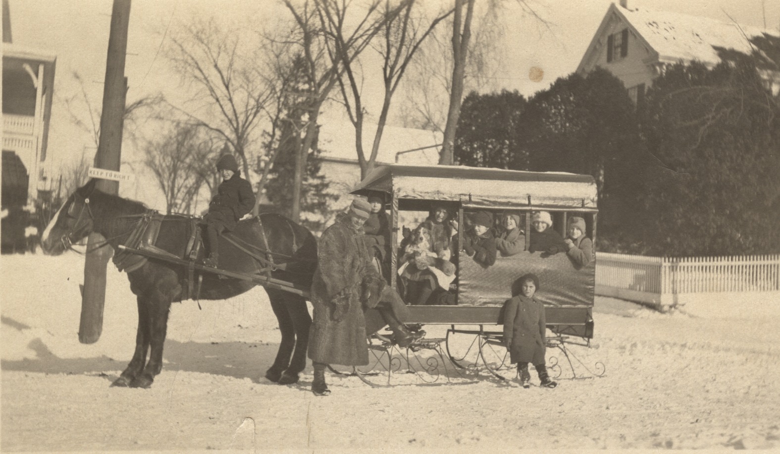 School Team (bus) c. 1915. Driver is Alvan T. Hatch. On horse is Dusty Rhodes. In front is Loren Piper. Behind driver is Webster Goodwin. Inside is Floretta Beauchimen (holding dog, "Chief"), Dorothy Mather, Olive Averill Stevens, Dorothy Piper, and Ida Averill Pineo.