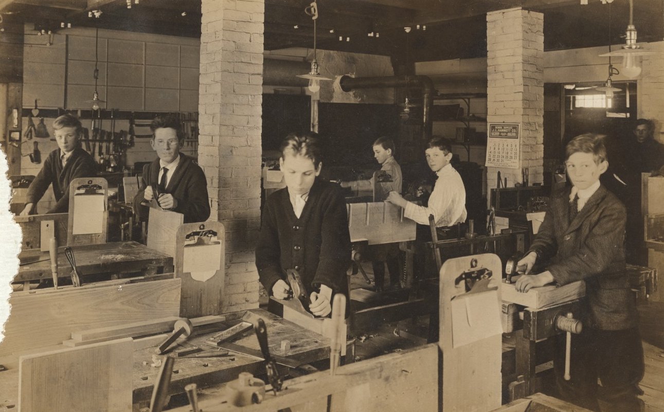 Pickering Grammar School. Woodworking class in the basement, January 1917.