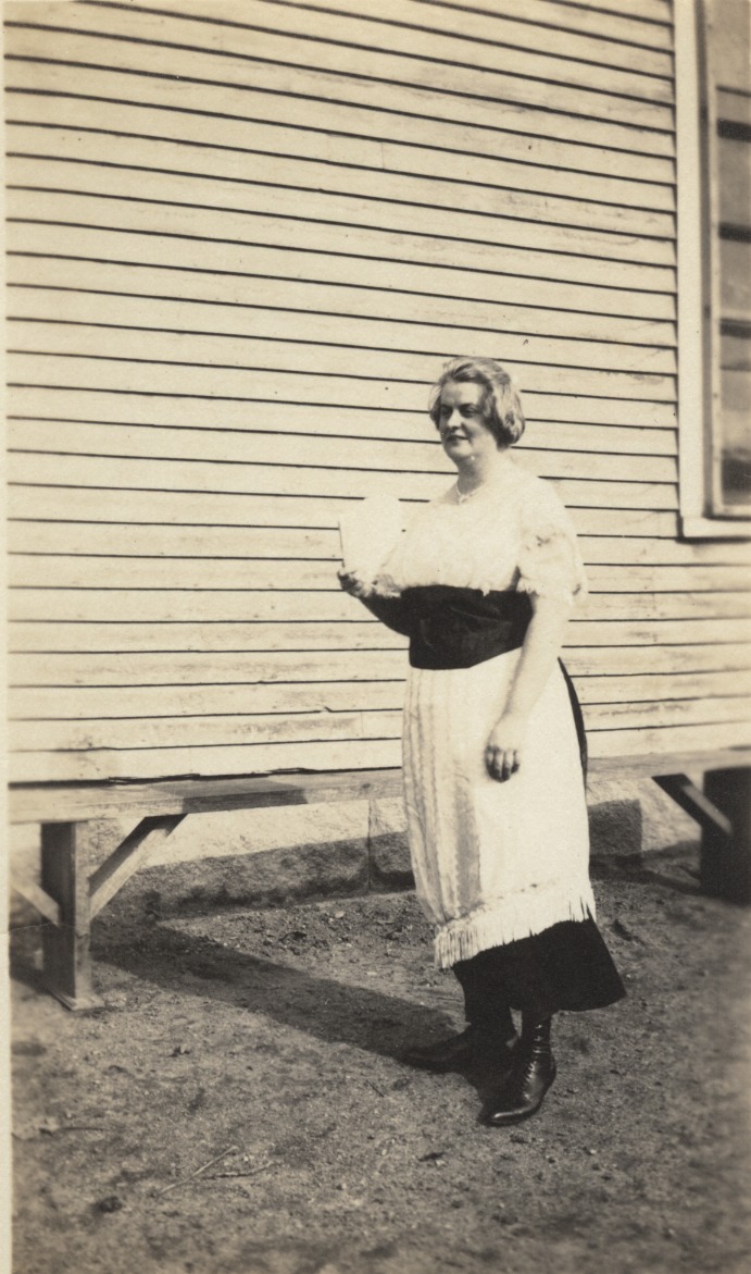 Pickering and Carpenter staff, fashion show. Miss Lillian Rollins as "High Fashion". C. 1920.