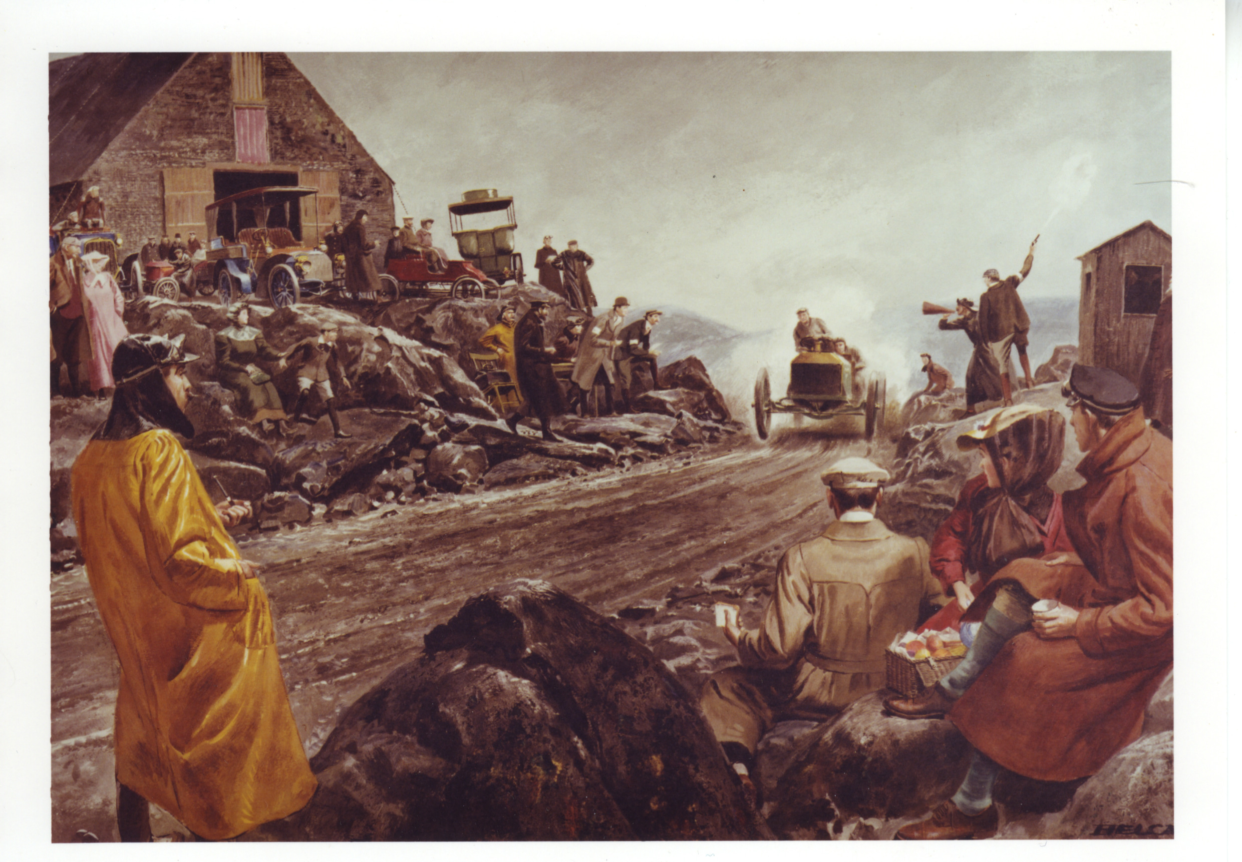 This painting by noted artist Peter Helck, "Climb to the Clouds", is of the second automobile race up Mt. Washington, July 18, 1905. William A. Hilliard of Boston set a record 20 minutes, 58 & 2/5ths seconds, in a 60hp Napier Gordon Bennett racer. Freelan O. Stanley was second in a 15hp Stanley at 22 minutes, 58 & 3/5ths seconds. From the Mt. Washington Auto Road Collection.