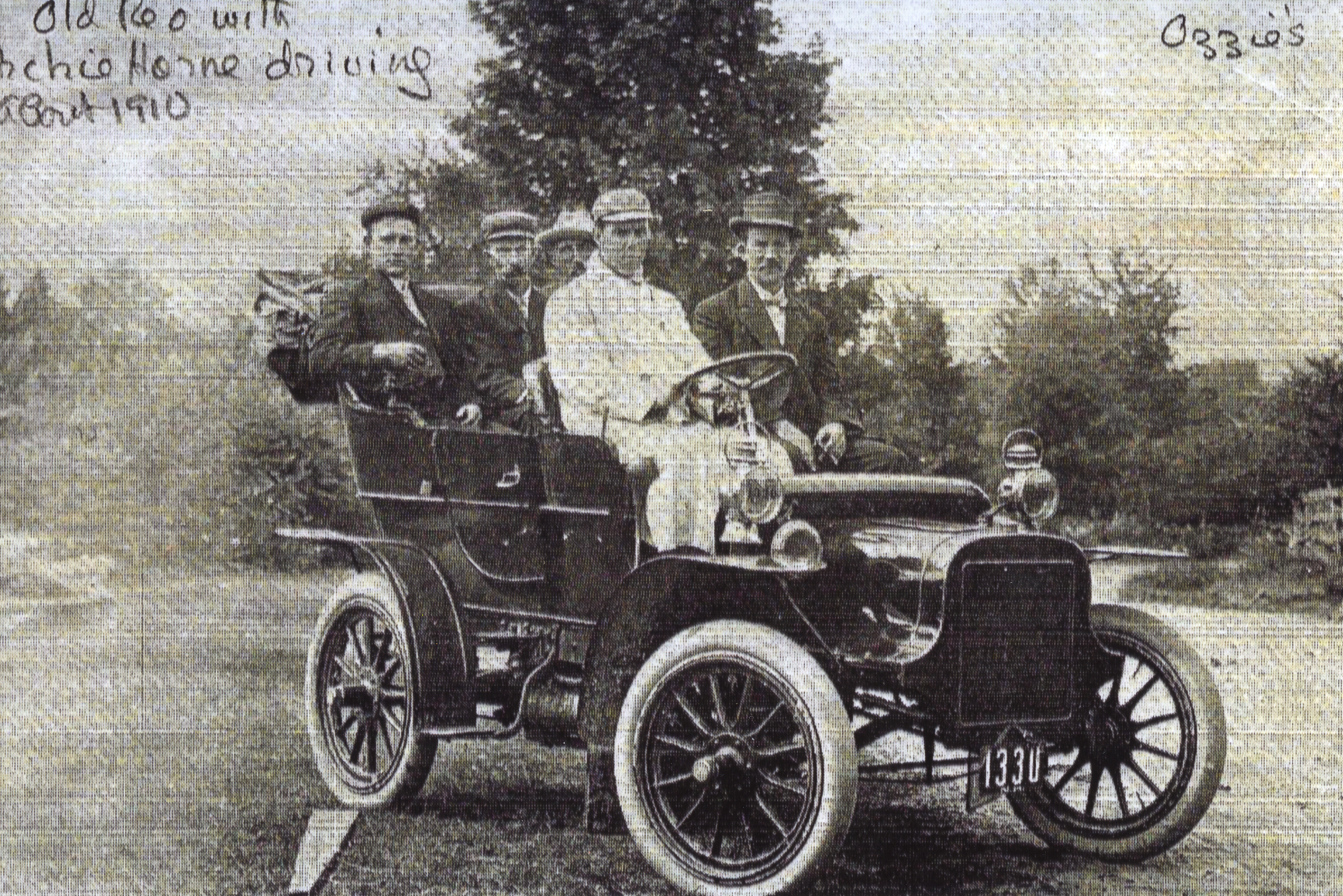 Archie Horne driving a REO (named after early company owner Ransom E. Olds, later called Oldsmobile). Archie founded Horne's Garage on North Main St. near the Durgin Block in 1909. The business continued until 1993, at other locations after 1937. The photo is c. 1910.