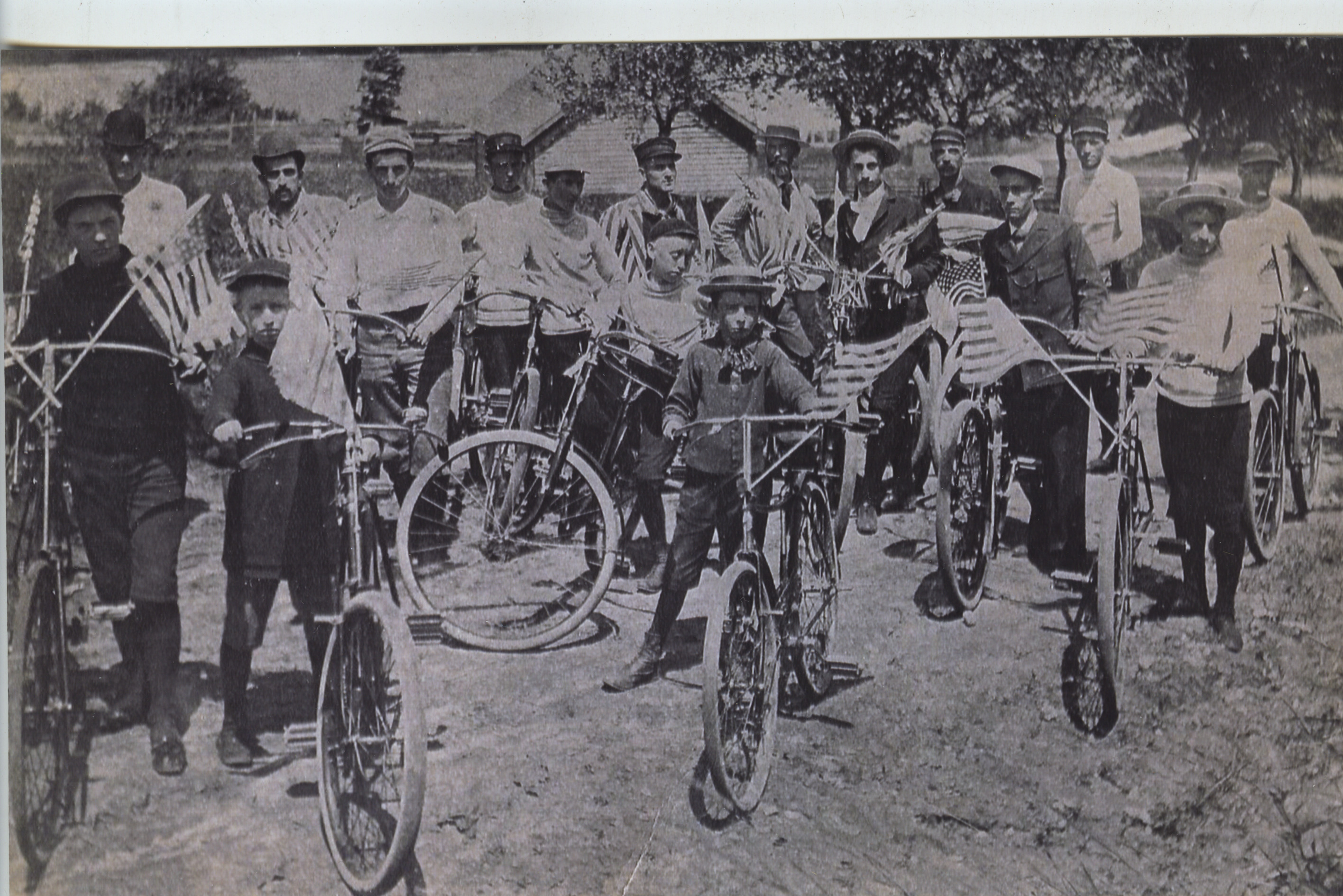 Bicycle group getting ready for a parade or an outing. No details, c. 1900.