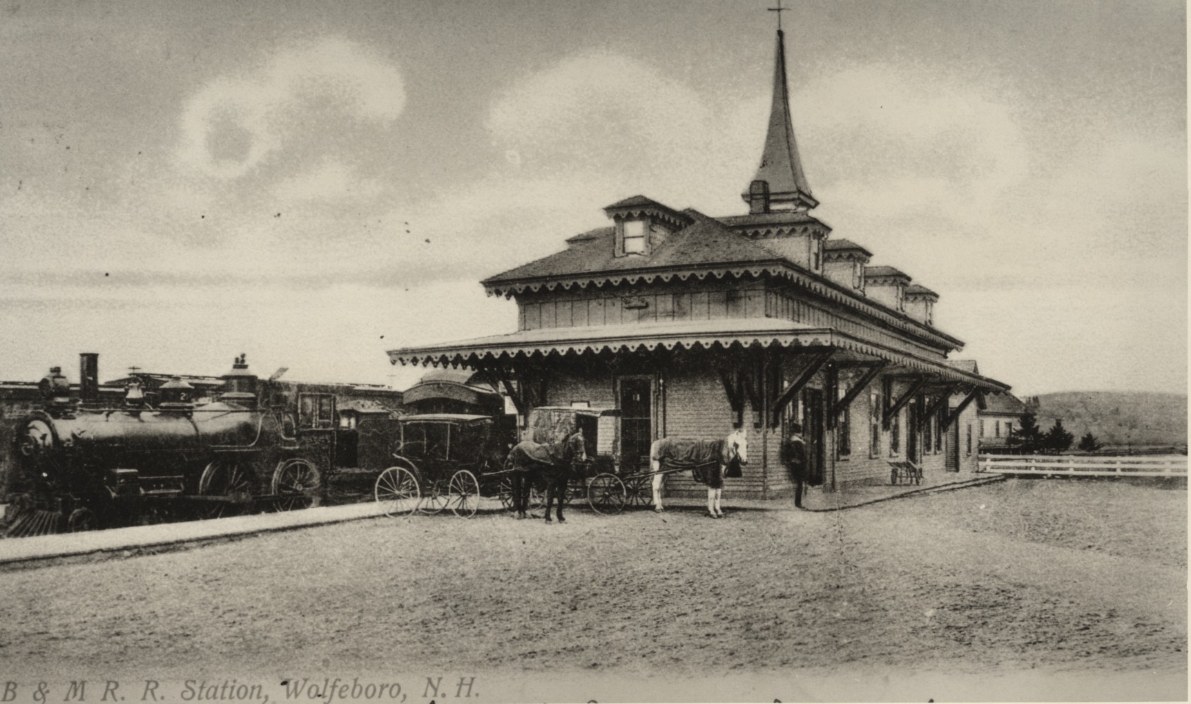Boston & Maine Railroad at Wolfeboro Station, c. 1905. This image was used on a postcard. The Station was one of the most elegant in the state.