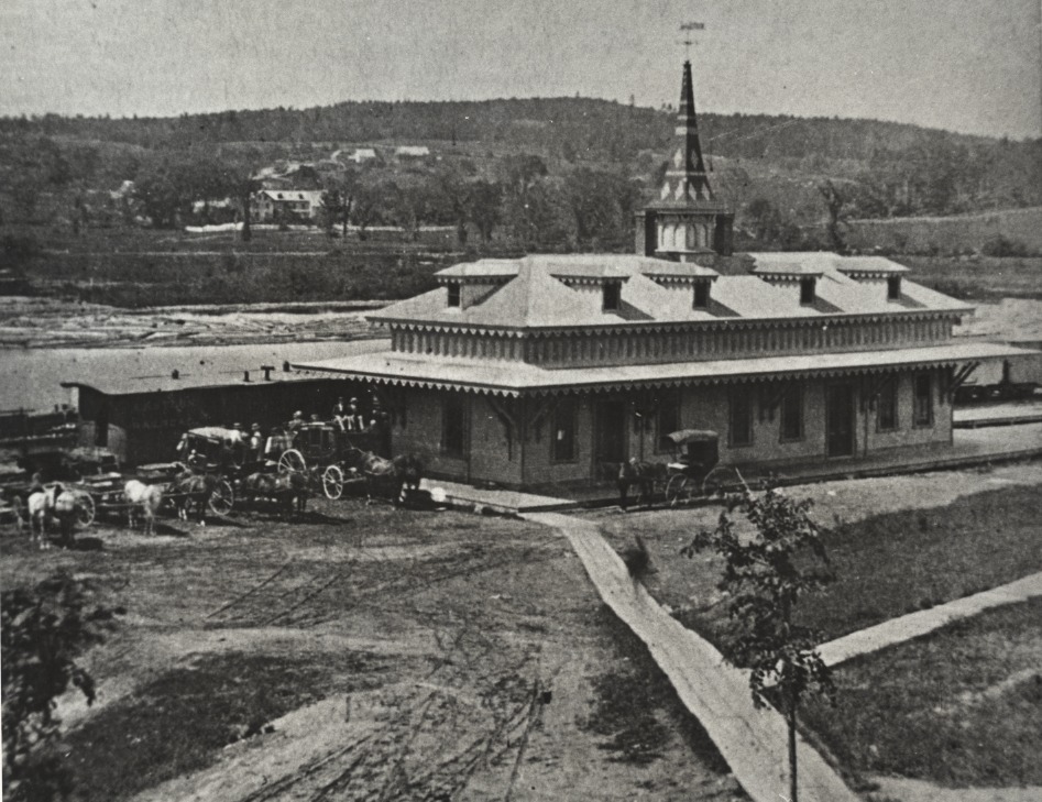 Boston & Maine Railroad Station at Wolfeboro, c. 1900. Livery wagons are on hand to meet the train and receive people and goods. The wooden sidewalk connects the Station to the Glendon House, built 1874, only a short distance away (on the site of the present Post Office).