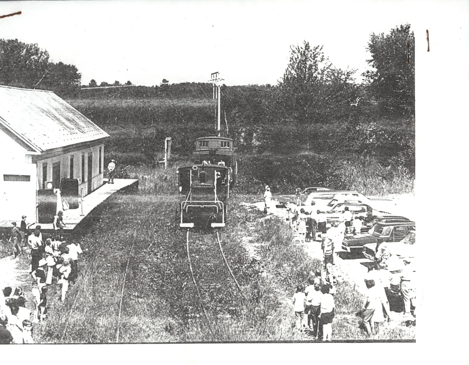The "100th Anniversary Train" on the tracks by the Wolfeboro Freight Building in 1972. Commemorating 100 years of railroading on the Wolfeboro Branch of the Boston & Maine Railroad. Engineer Thad Berry rolls Wolfeboro RR's Engine #9, a 25 ton Plymouth Locomotive, thru the weeds just east of the station. After a few speeches, short rides were conducted to Wolfeboro Falls and back.