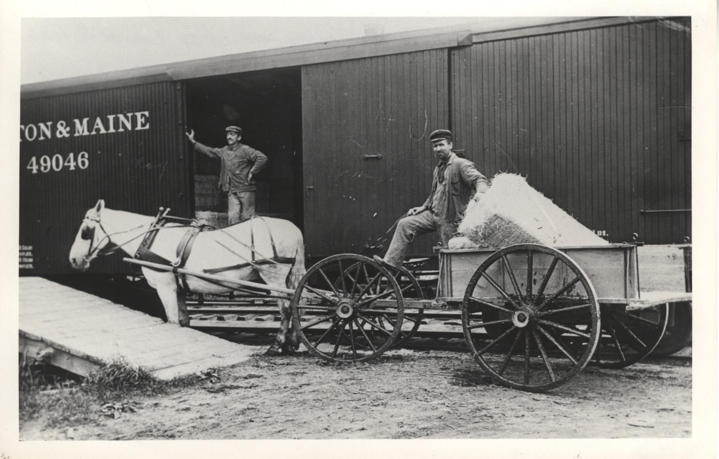 Boston & Maine train at the Excelsior Mill siding at Wolfeboro Falls. William Howard Willey, in the boxcar, was one of a dozen or more teamsters (have horse & wagon, will work) in town. This excelsior load delivery is c. 1920. Made from poplar wood, excelsior was made in large quantities from logs rafted into Back Bay & was an important local industry. The largest maker was the steam-powered Berry Mill in Wolfeboro Falls, operating from 1895 into the 1970's. The buildings remained in place until they burned in 1994.