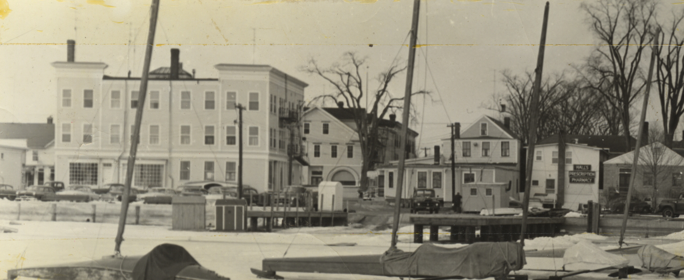 Ice boats at rest on Lake Winnipesaukee, near town docks. Large building is Peavey Block, now Avery Block. Bank Building is in the center, across South Main Street. C. 1935.