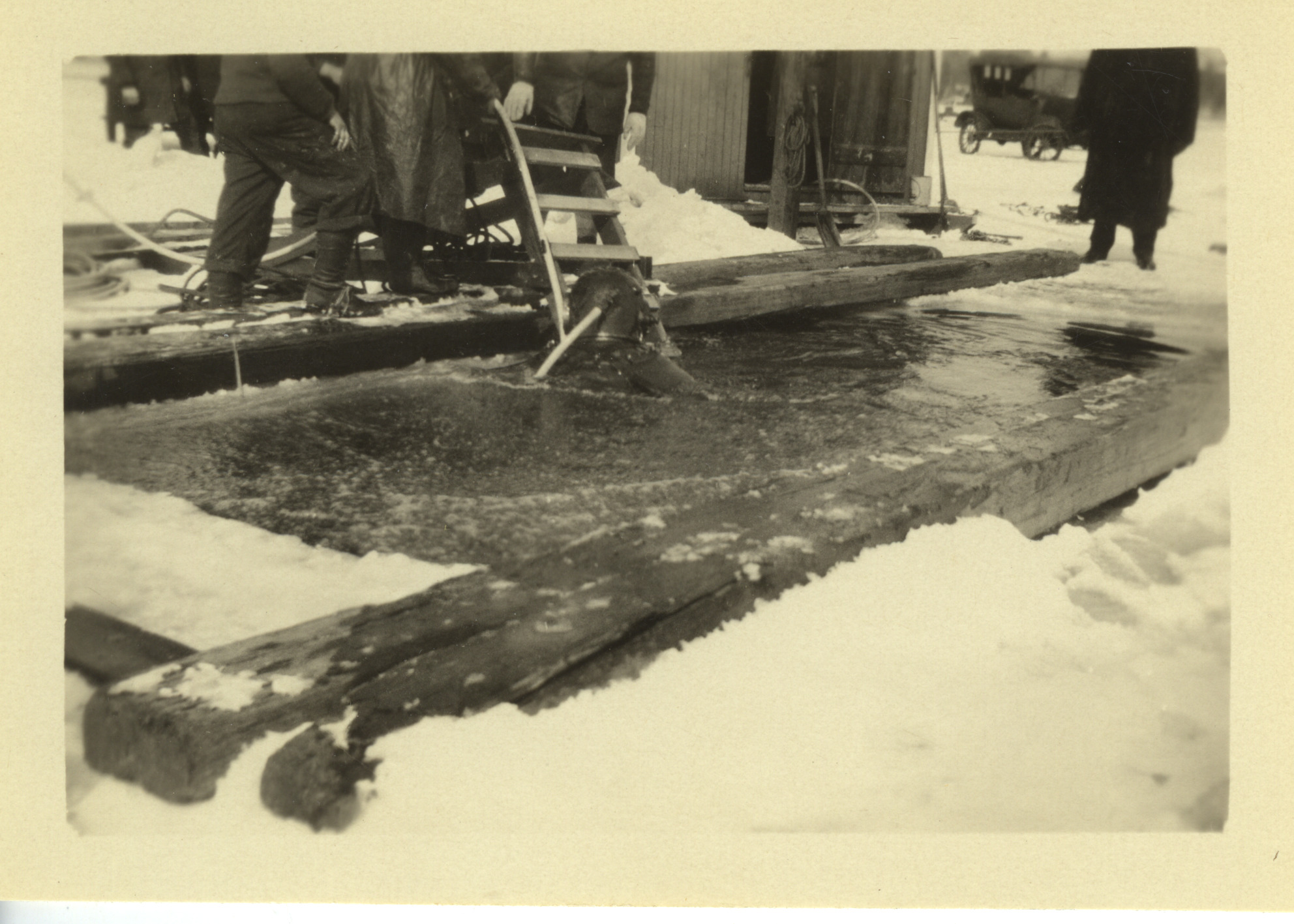 Salvage Company in action after a car broke through the ice. An opening has been cleared for access and wood beams placed at the sides. A diver is going in to put a hook on the car.