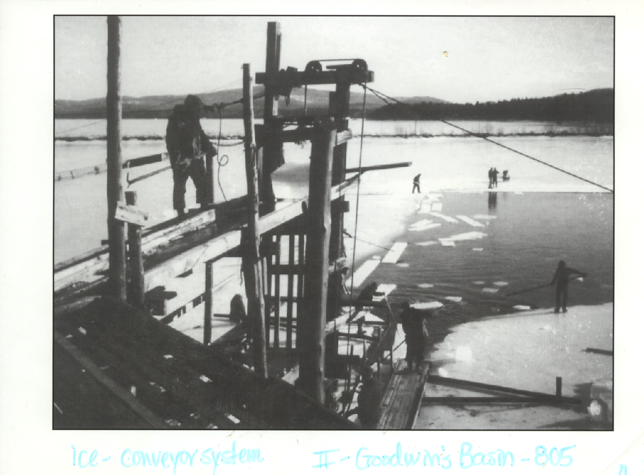 Ice harvesting at Goodwin's Basin off Center Street (the pond isolated from Crescent Lake by the railroad causeway), early 1900's. The elaborate conveyor system loads the cut blocks of ice for transport.