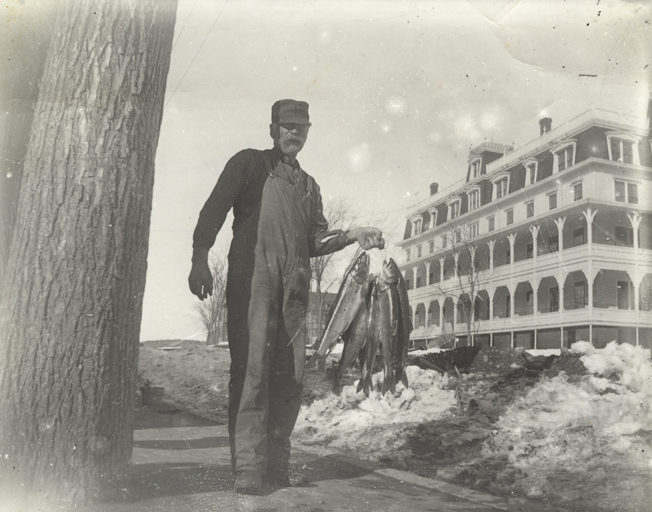 A good day's catch on the ice. The Hotel Elmood, now the site of the Post Office, is on the right. C. 1900.