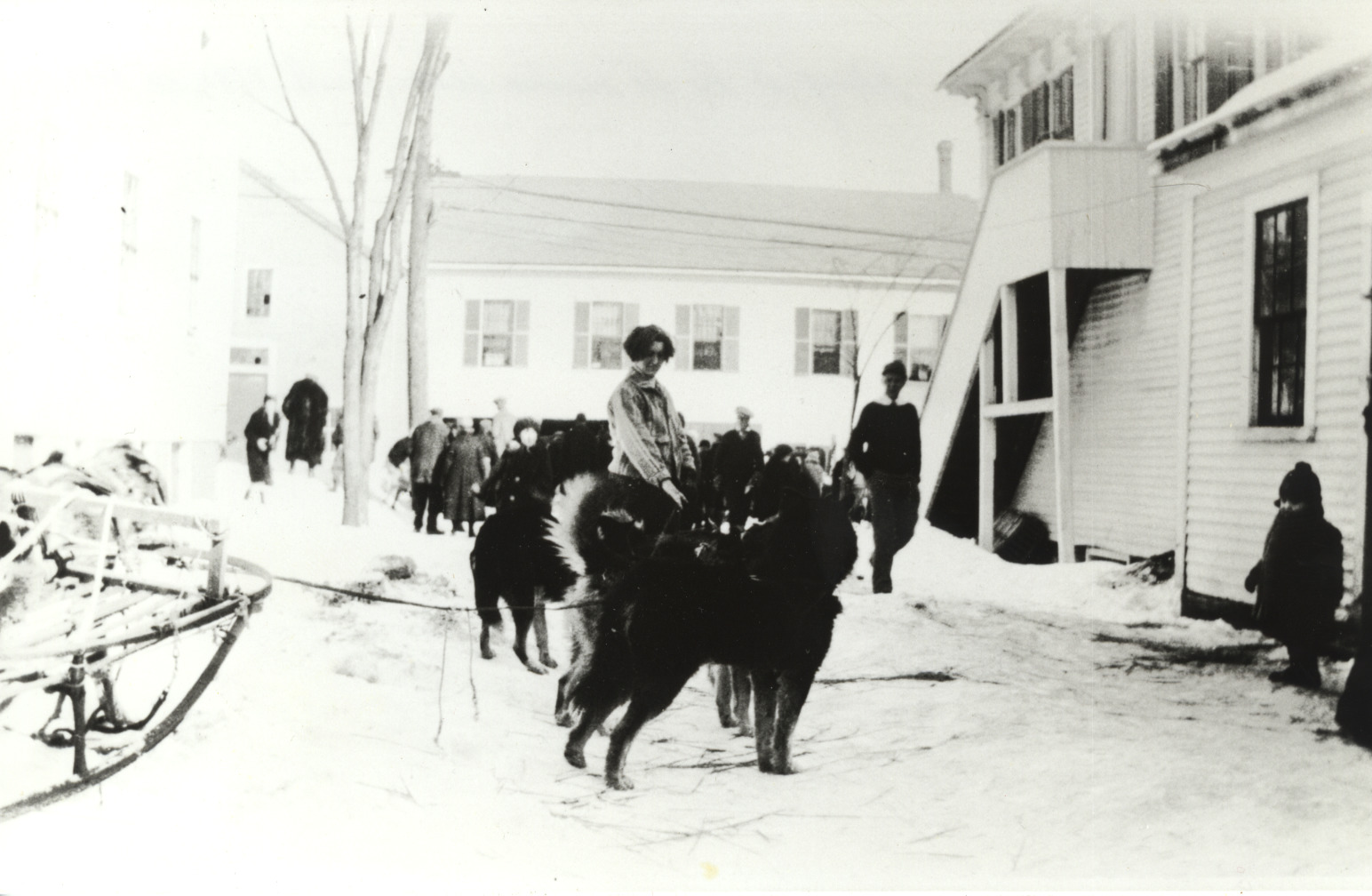 Dog Sled racing, Winter Carnivals, c. late 1920's. Waiting their turn on North Main Street near the Sheridan House.