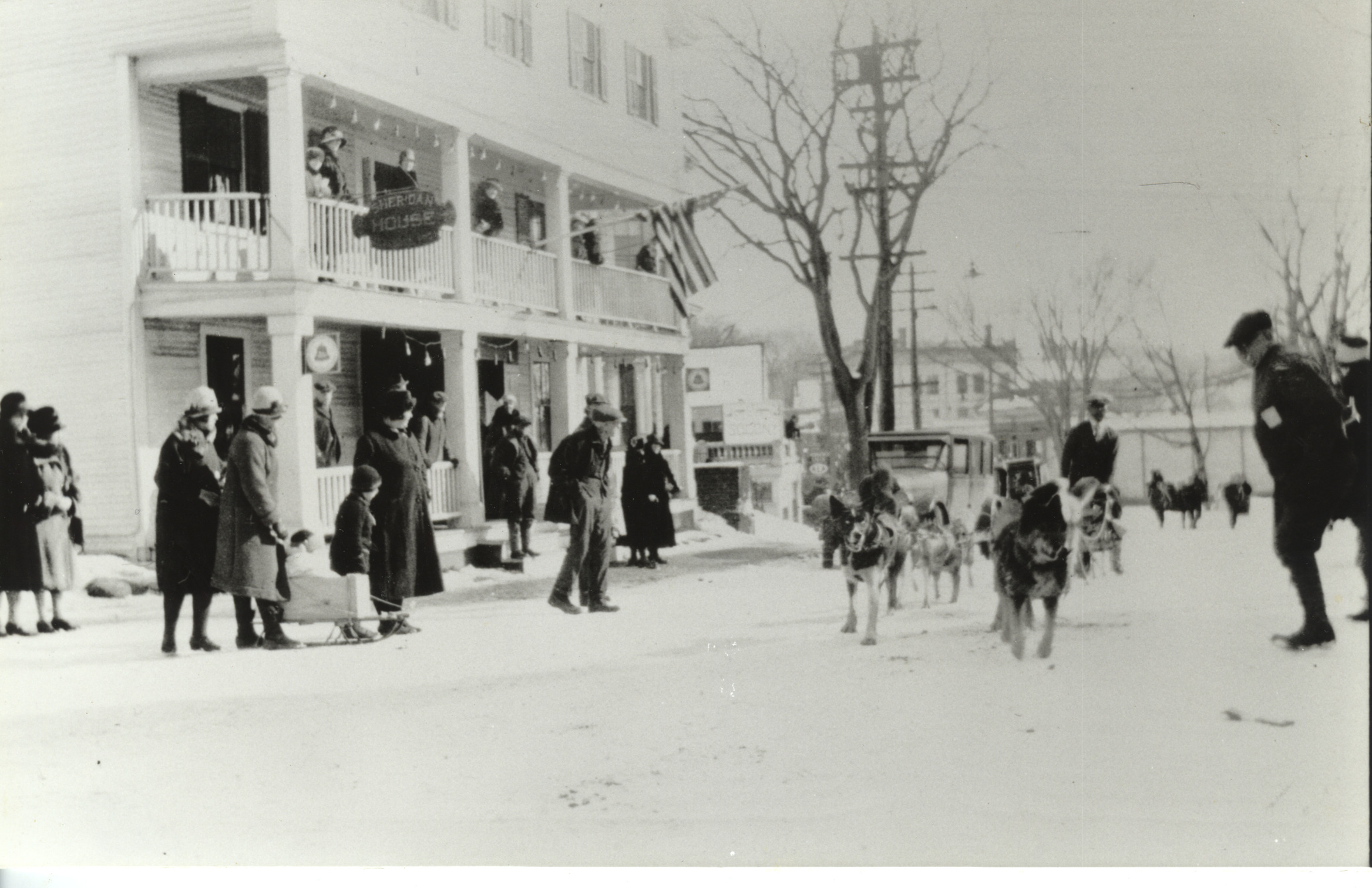 Dog Sled racing, Winter Carnivals, c. late 1920's. Race in progress, in front of the Sheridan House on North Main Street.