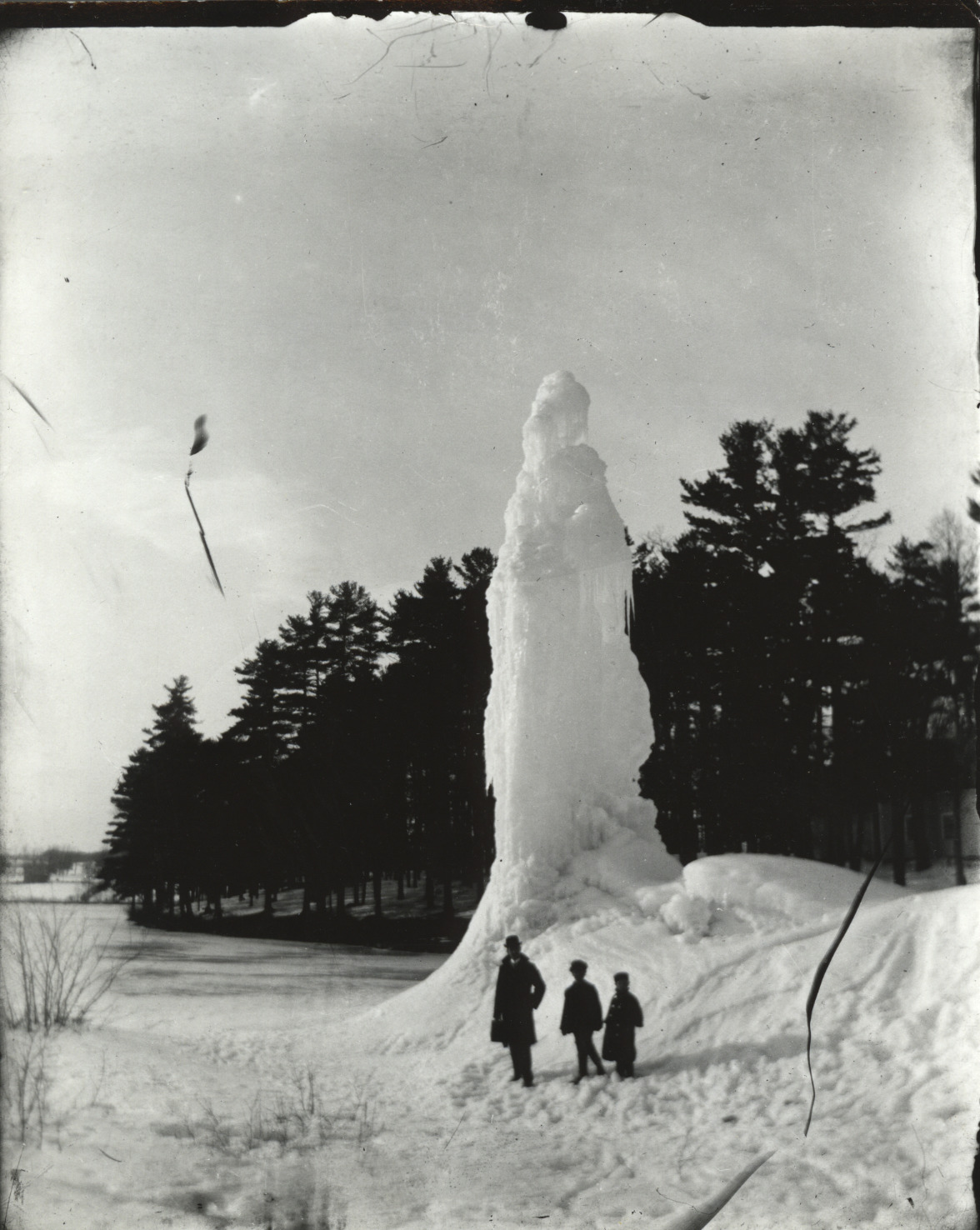 Ice formation produced by an overflow vent on the area formerly called Back Bay, before it was filled. Now the area of the Bank at the Clark shopping center on Center Street. A similar situation occurred in South Wolfeboro.