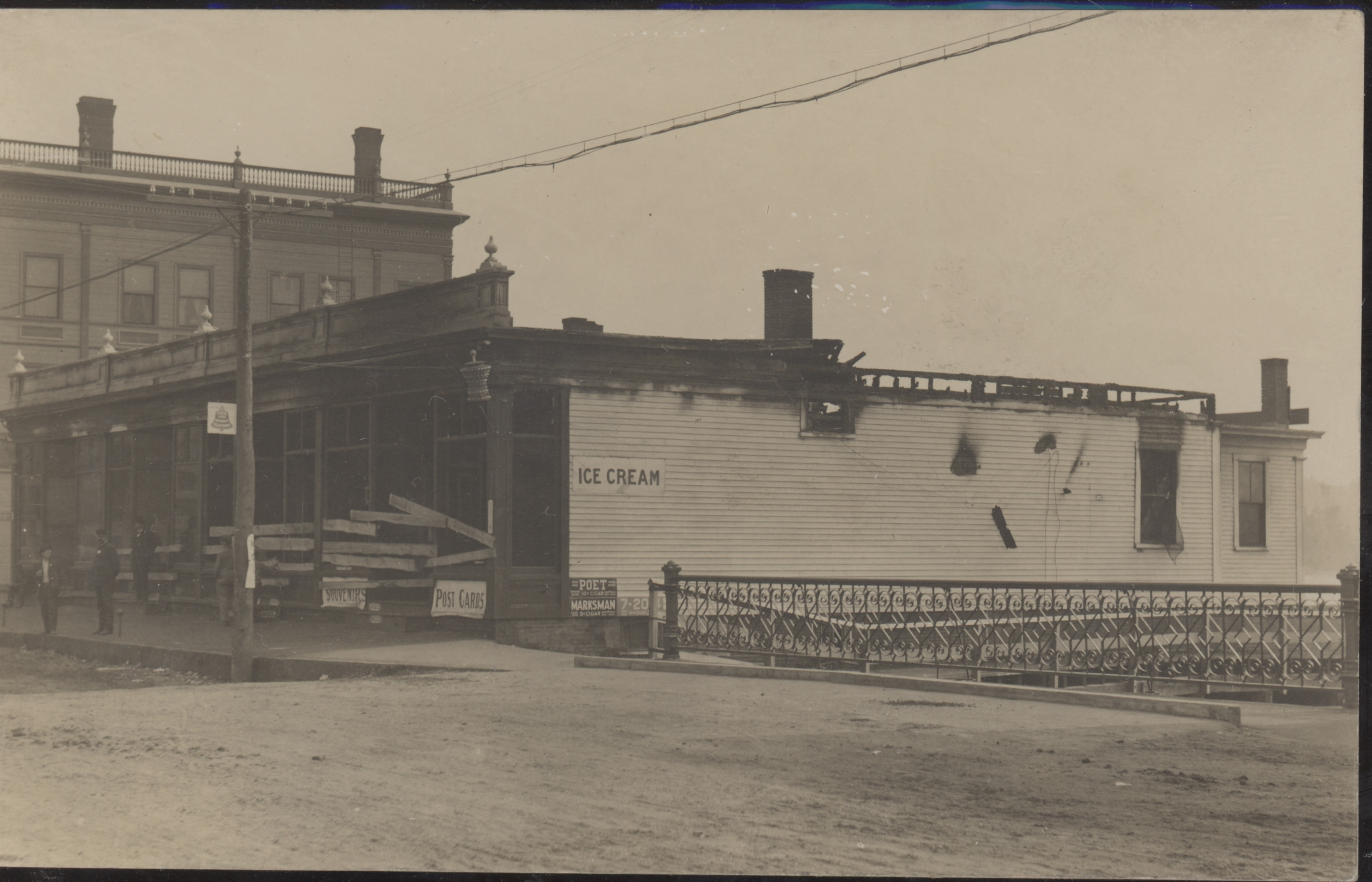 This site on South Main Street, between the bridge and the Avery Building, has had an early history of trouble. The original three story building with a mansard roof, built in the 1860's, was destroyed in a massive fire in 1899. A one story building was erected in late 1899, and is shown in this 1908 card after it burned down. Does seem rather morbid to make a postcard of a disaster. The replacement building, of similar size and shape, was built in 1909 and still stands today.
