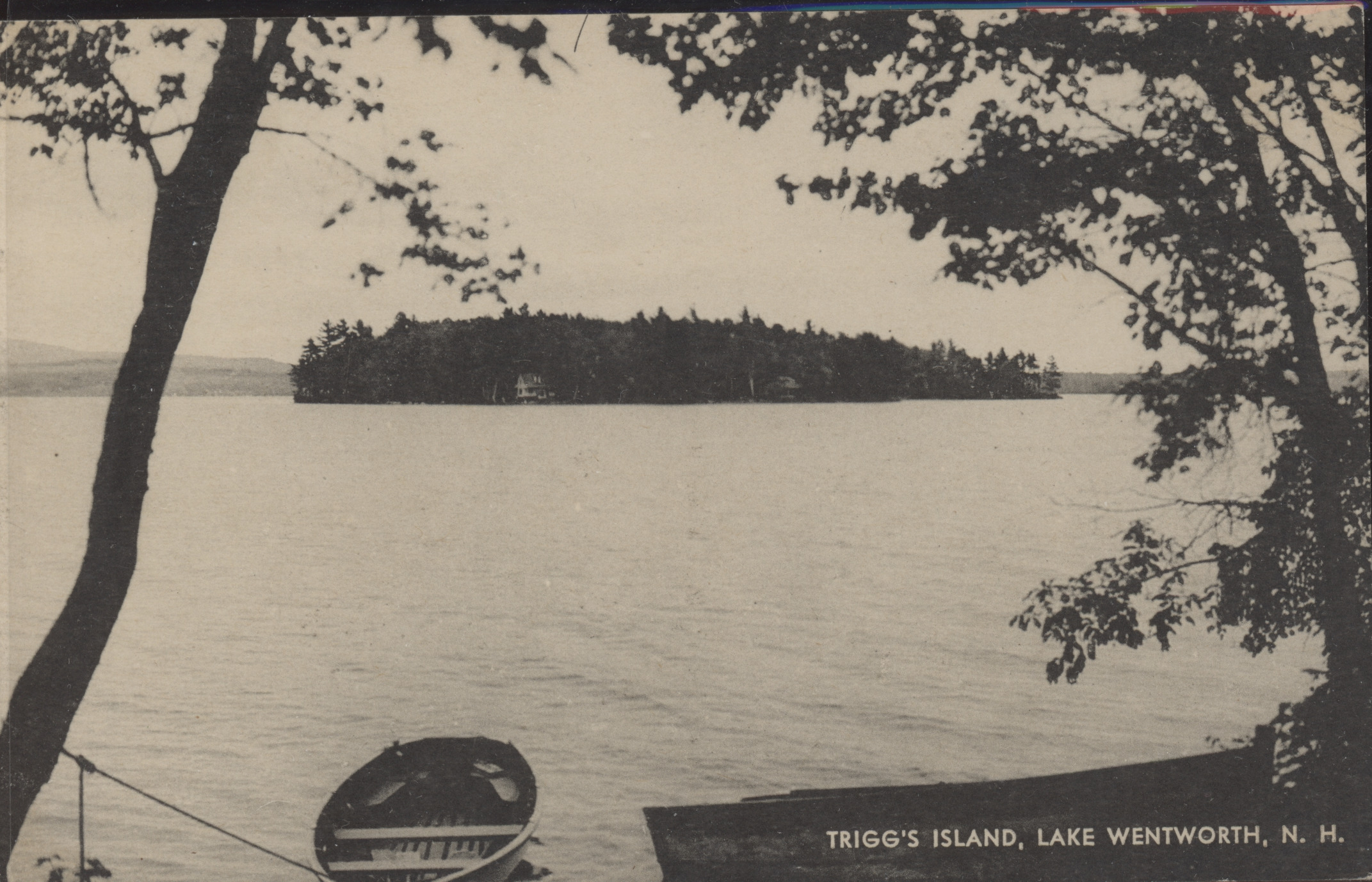 Triggs Island in Lake Wentworth, taken from Triggs Landing on Gov. Wentworth Hwy. The second largest island in the lake at 10 acres, there are 10-12 summer camps there. Once know as Minister's Island from the number of Massachusetts ministers who had camps there, it is now named for Thomas Triggs, the original owner. C. 1940.