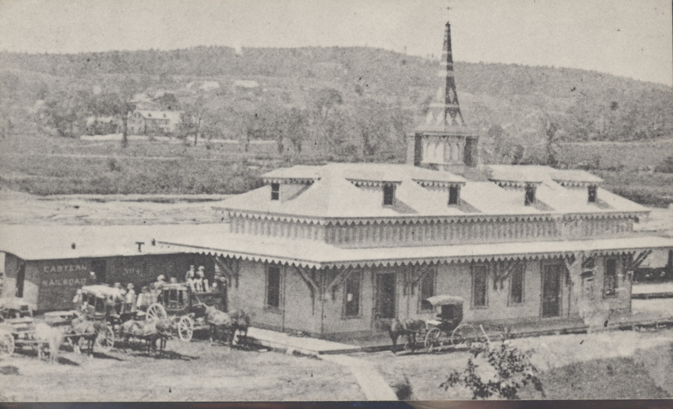 Wolfeboro Station about 1875. Eastern Railroad train ran on Railroad Avenue all the way to the Dock Station. Stagecoaches are ready to go to hotels and Melvin Village. Recreated.