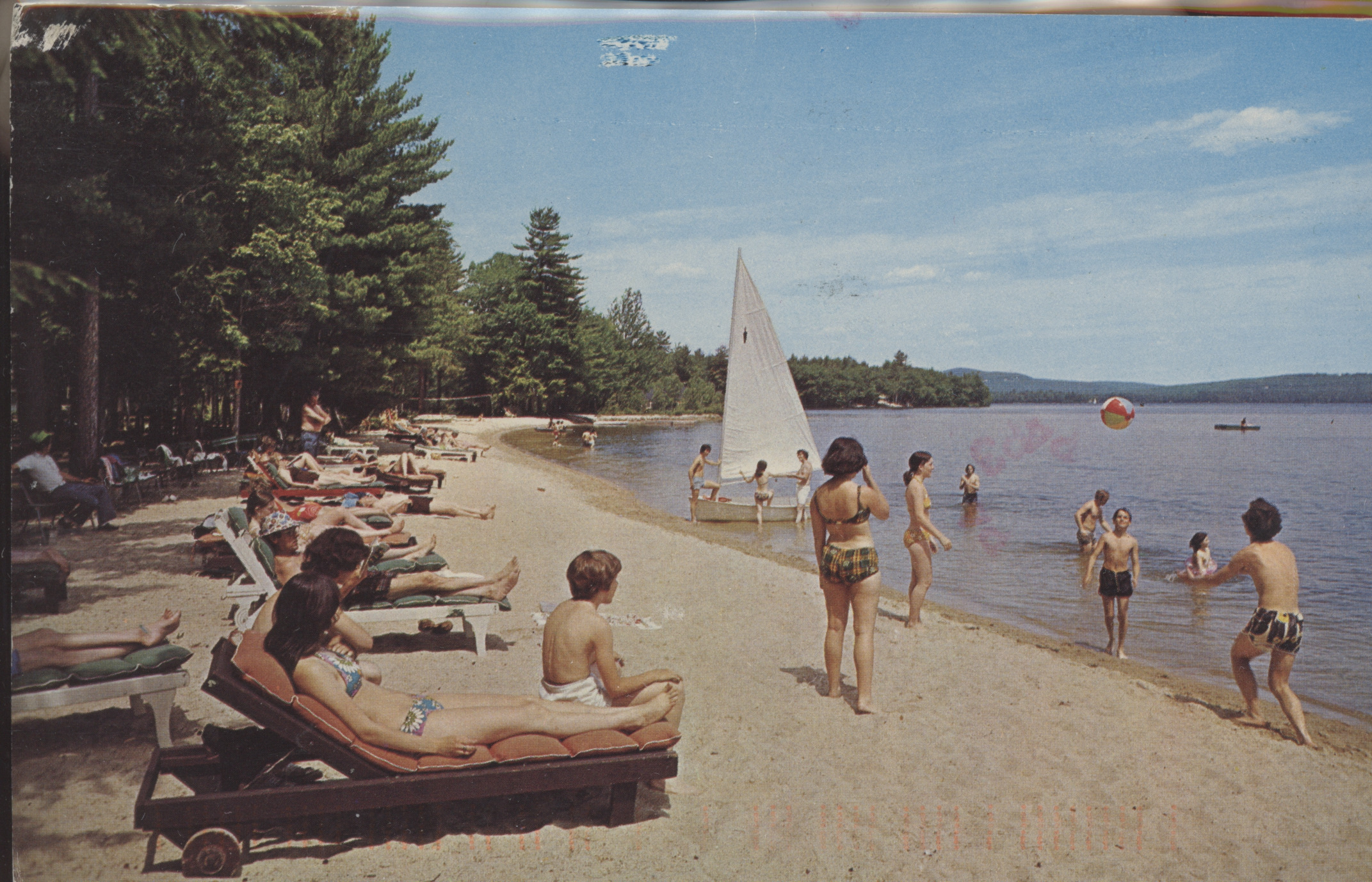 Allen "A" Resort beach on Lake Wentworth. Beach in now town-owned Albee Beach. Card dated 1994. The Allen "A" Resort was originally called the Allen "A" Camp; several postcards are in the listing under the Camps group.