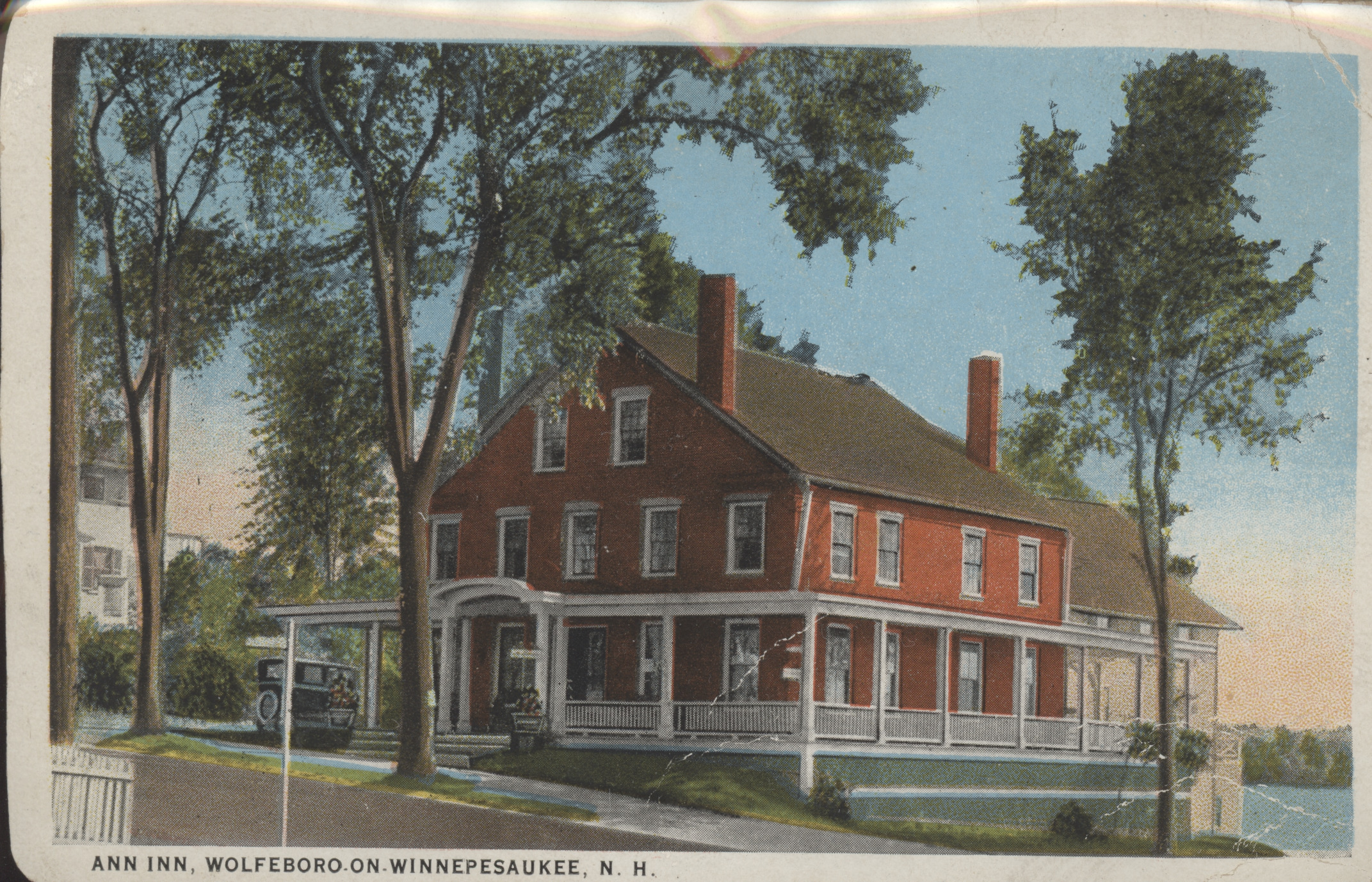 Built in 1847 as the Belvue House, this became the Ann Inn in 1921. The location was across the street and uphill from the present Post Office. Torn down in 1940, the street area became a gas station and the lakefront portion became Cate Park. In 1967, the street location became Town Park. The card is marked 1930.