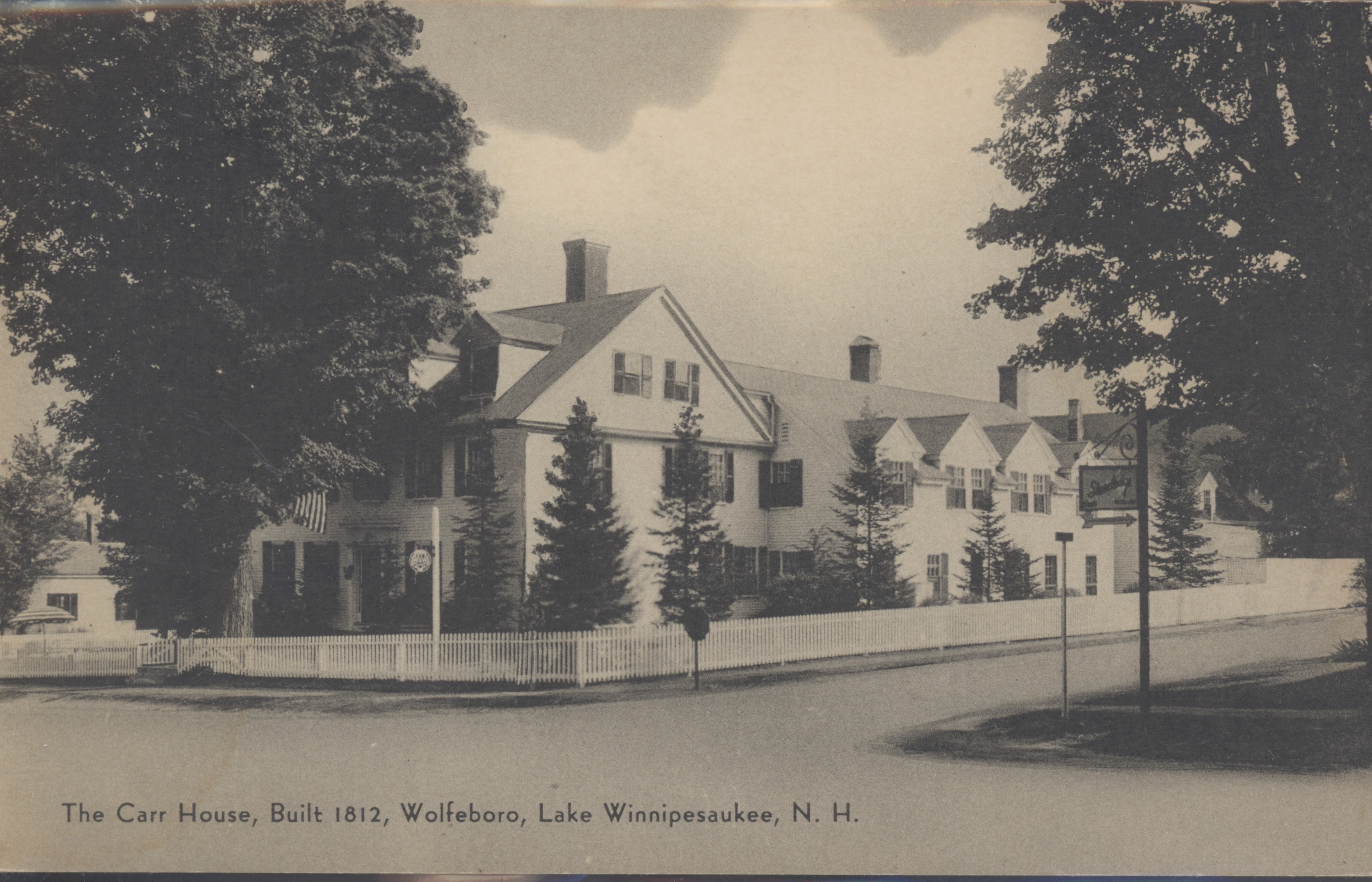 The Carr House was built as a residence in 1812 by Nathaniel Rogers, first used as a guest house called the Copper Kettle in 1931, then the Carr House in 1936, and became the Wolfeboro Inn in 1959. Located at the corner of North Main Street and Sewall Road. Card is c. 1940.