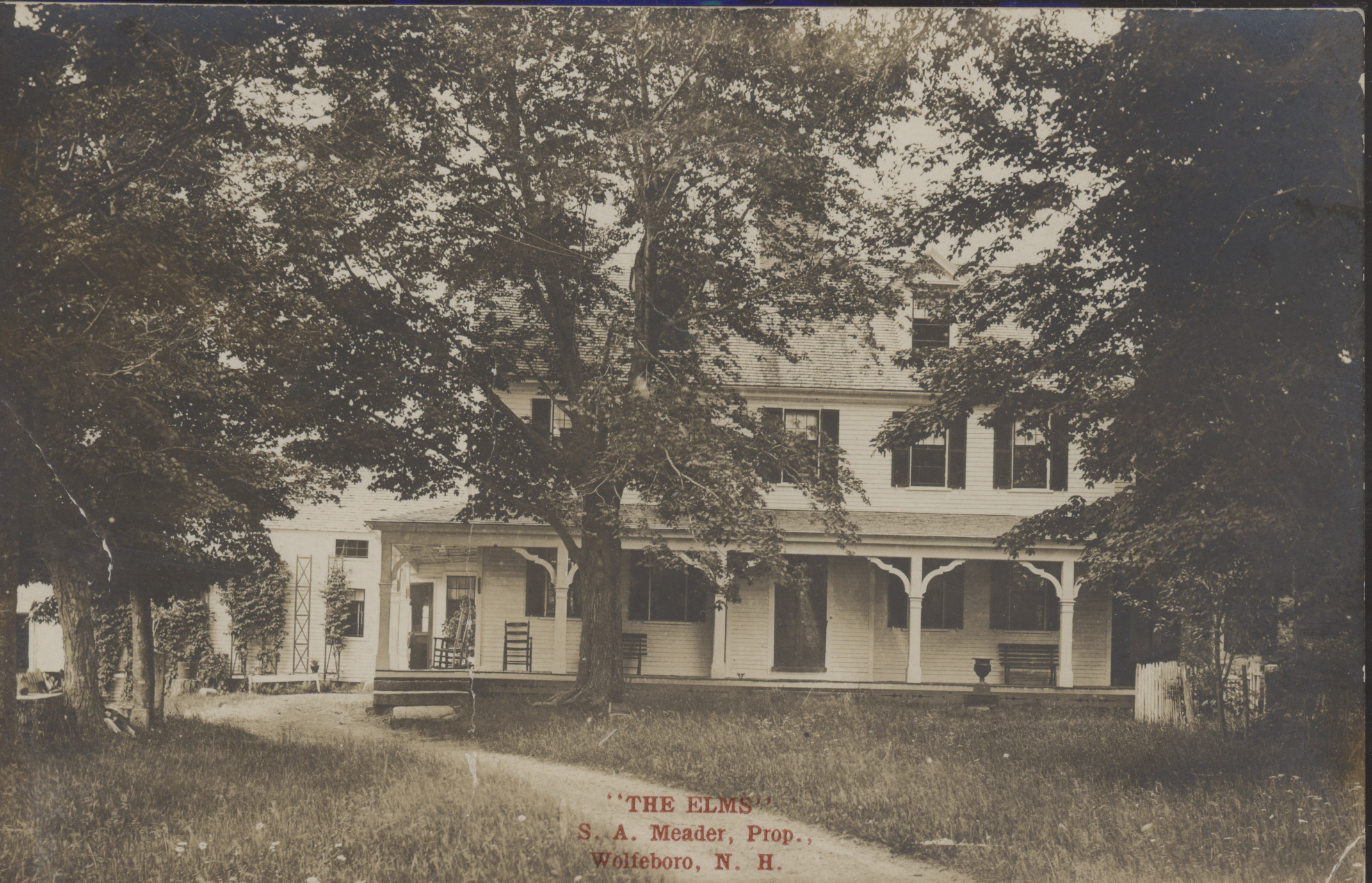 The Elms is listed as a boarding house and cottages from 1897 into the early 1900's, on North Main Street. There isn't much information on this house. The location today is the Sky Ridge Condominiums. Card is marked 1941. Samuel A. Meader was the 1897 Proprietor, so the card may be early 1900's.