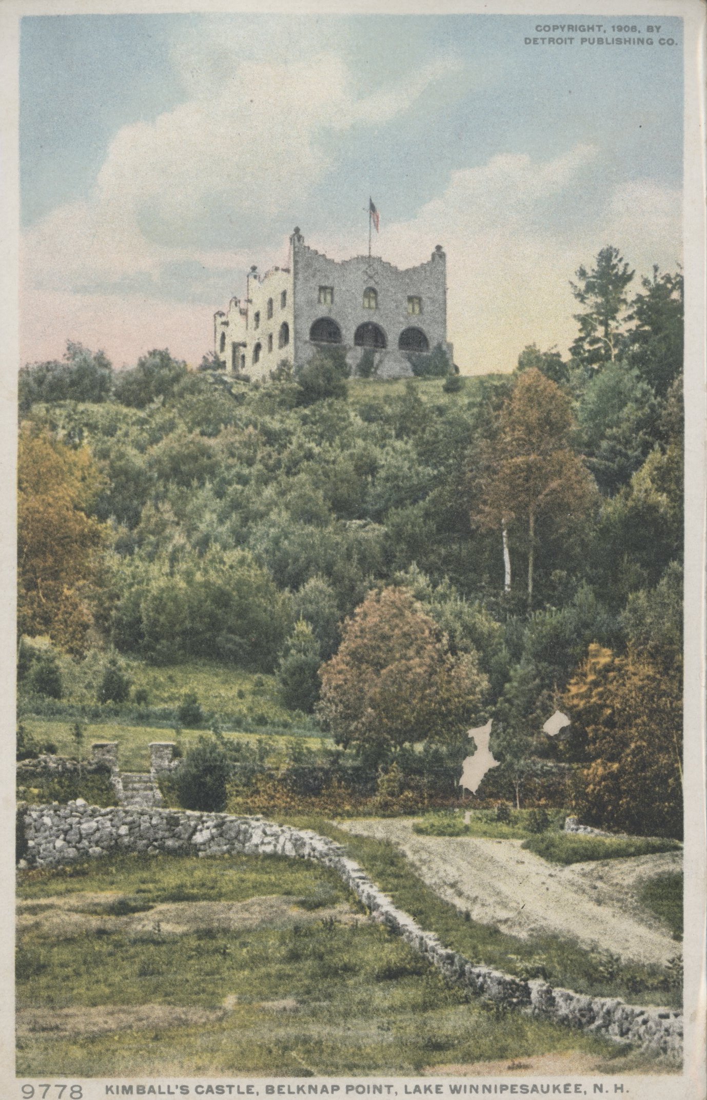 Kimball's Castle on Belknap Point. This medieval style castle and several outbuildings was built in 1894 as the summer estate of railroad tycoon Benjamin Kimball. Built by Italian stonemasons using local granite and materials imported from Europe, its construction cost was about $50,000. Much of the property is in a conservation trust, with trails open to the public. The Castle and Innkeepers Cottage are privately owned, with the Cottage available for rent. Restoration of the deteriorated Castle has been planned, but has not yet occurred. Cards 7 thru 11 date to the 1910's.
