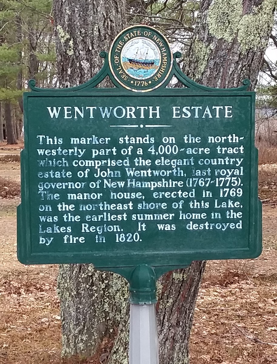 This State Marker is on Route 109, at the entrance to the Wentworth State Park, by the beach area also known as Clow's Beach (after the family that donated the property to the State). The early construction of Gov. John Wentworth's summer house led to Wolfeboro's claim as "The Oldest Summer Resort in America" as noted on the signs on major roads at the town lines.