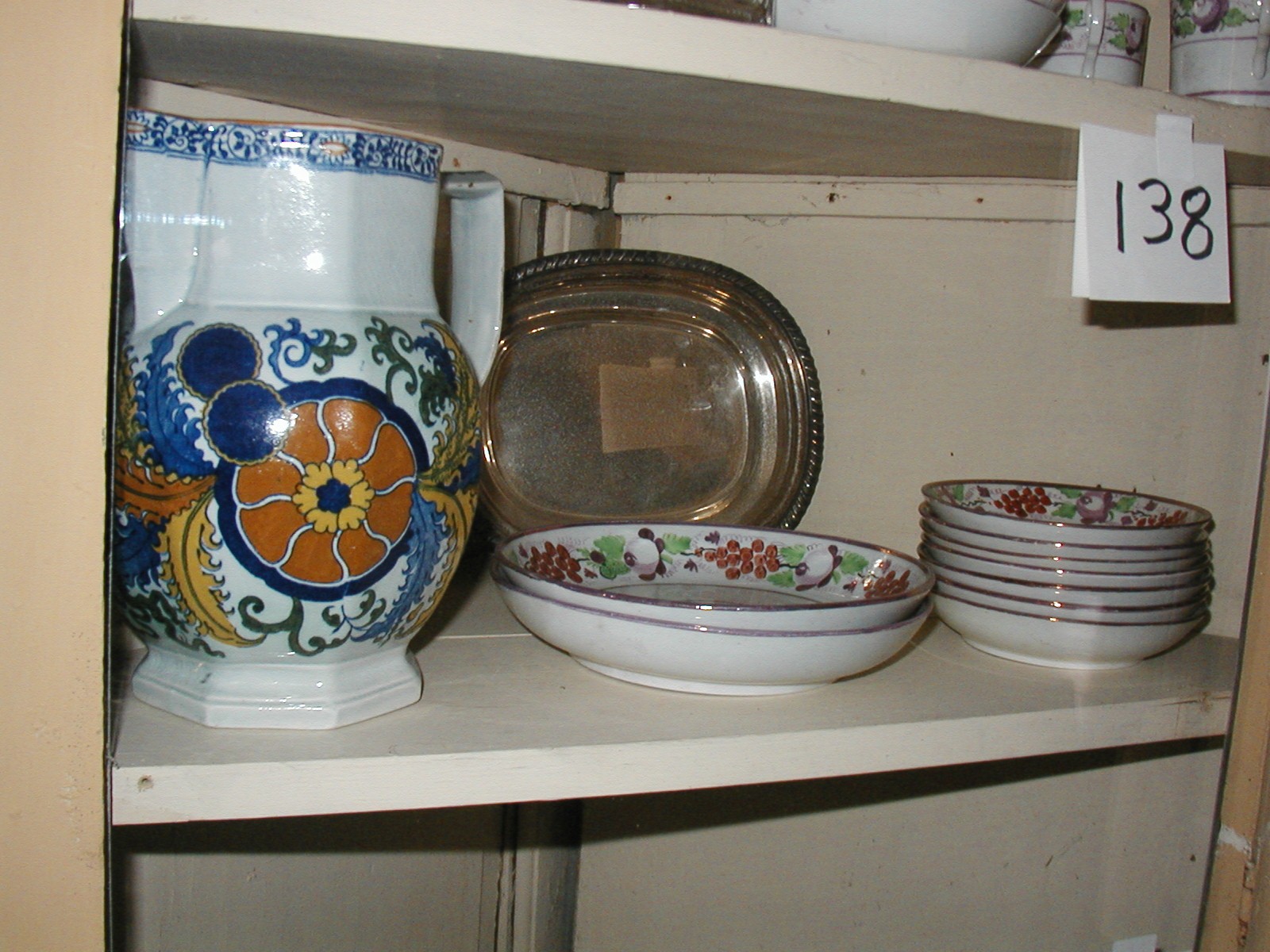 On the right are seven pink lustre coffee saucers. From colonial times to the early 20th century it was common practice to pour the coffee from the cup to the saucer to allow it to cool quicker. The coffee would then be sipped from the saucer.