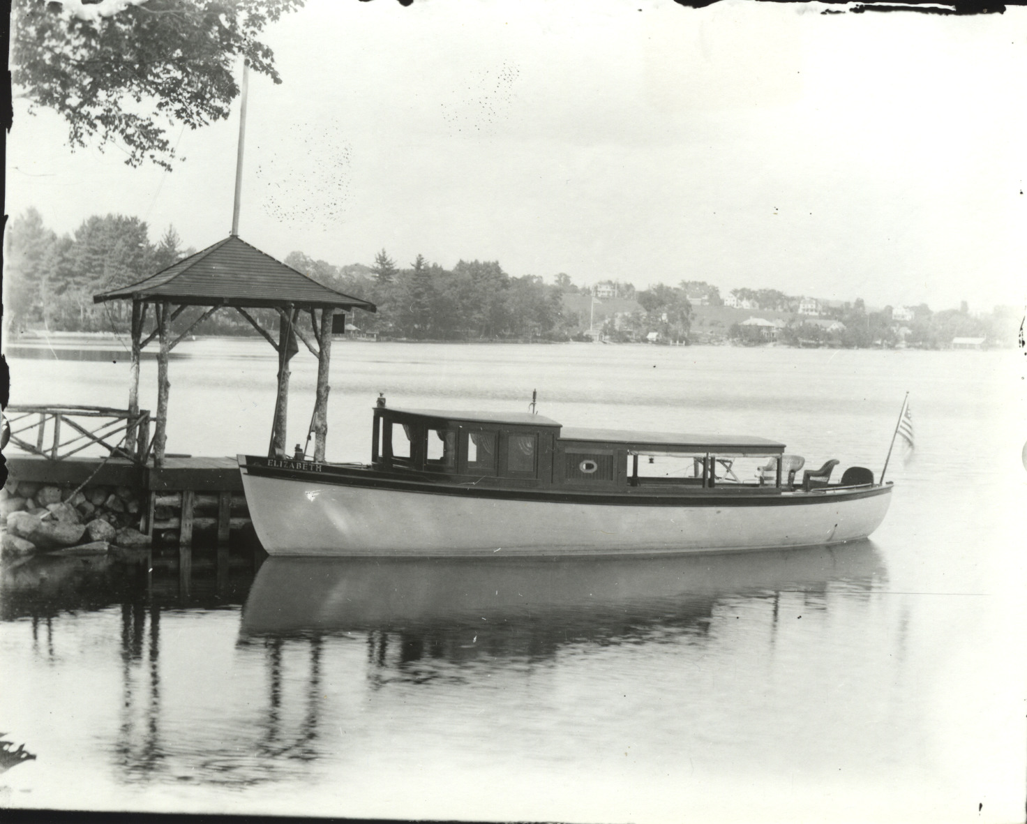 The newly purchased launch Elizabeth was one of several vessels owned by Rev. A. Edwin Keigwin, tied up at his summer home "Wiscasset", on Sewall Rd. Photo taken August 29, 1905.