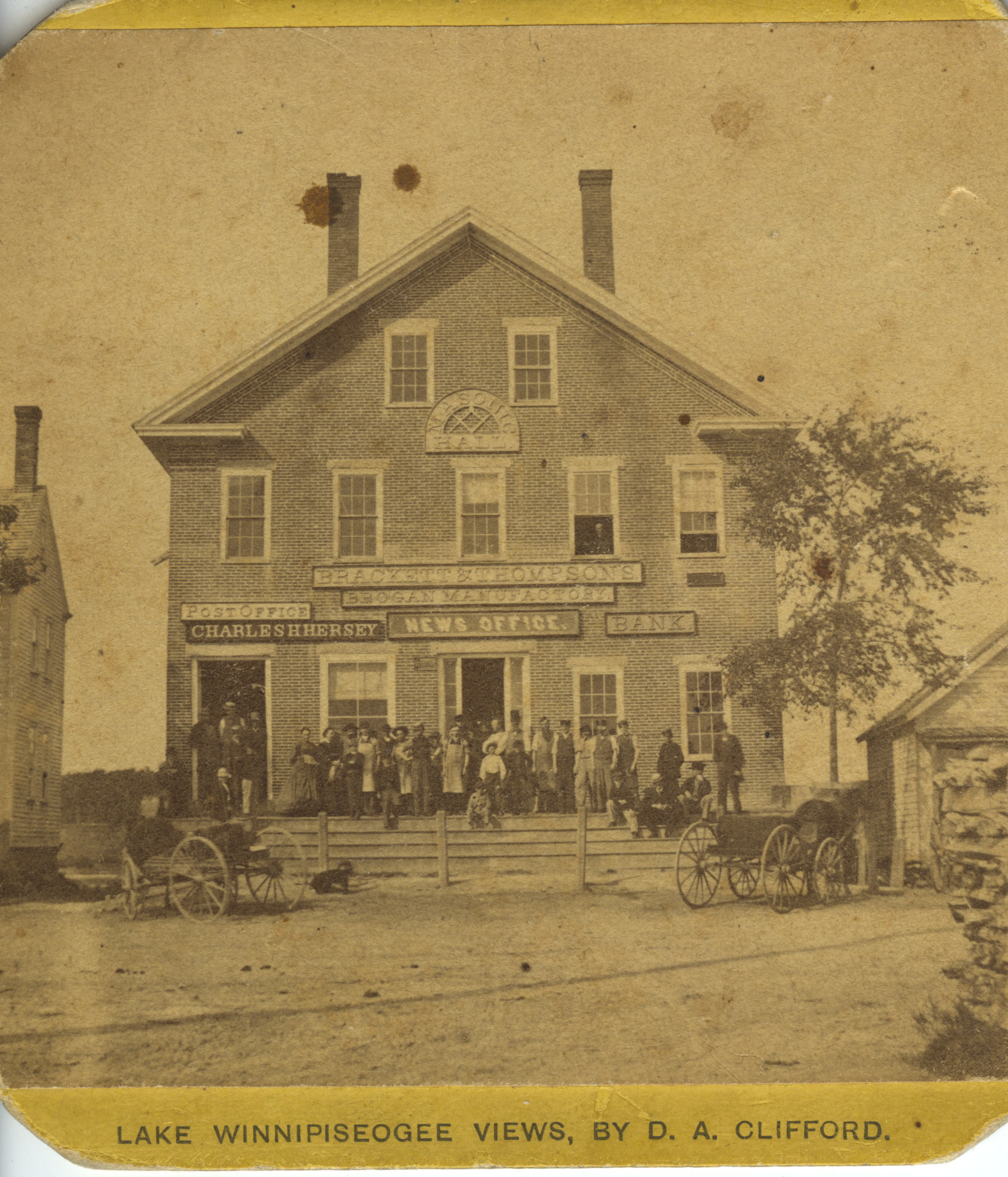 This is the earliest known view of the Bank Building, dating to c. 1865. The building dates to 1856, bult for the shoe factory. The signs for the upper floors include: Masonic Hall (they moved out after the Civil War; and Brackett & Thompson's Brogan Manufactory. The first floor includes: Charles H. Hersey's Grocery & General Store, which included the Post Office; the Granite State News; and the Lake National Bank. The building on the left was torn down, c. 1871, to create Railroad Ave.