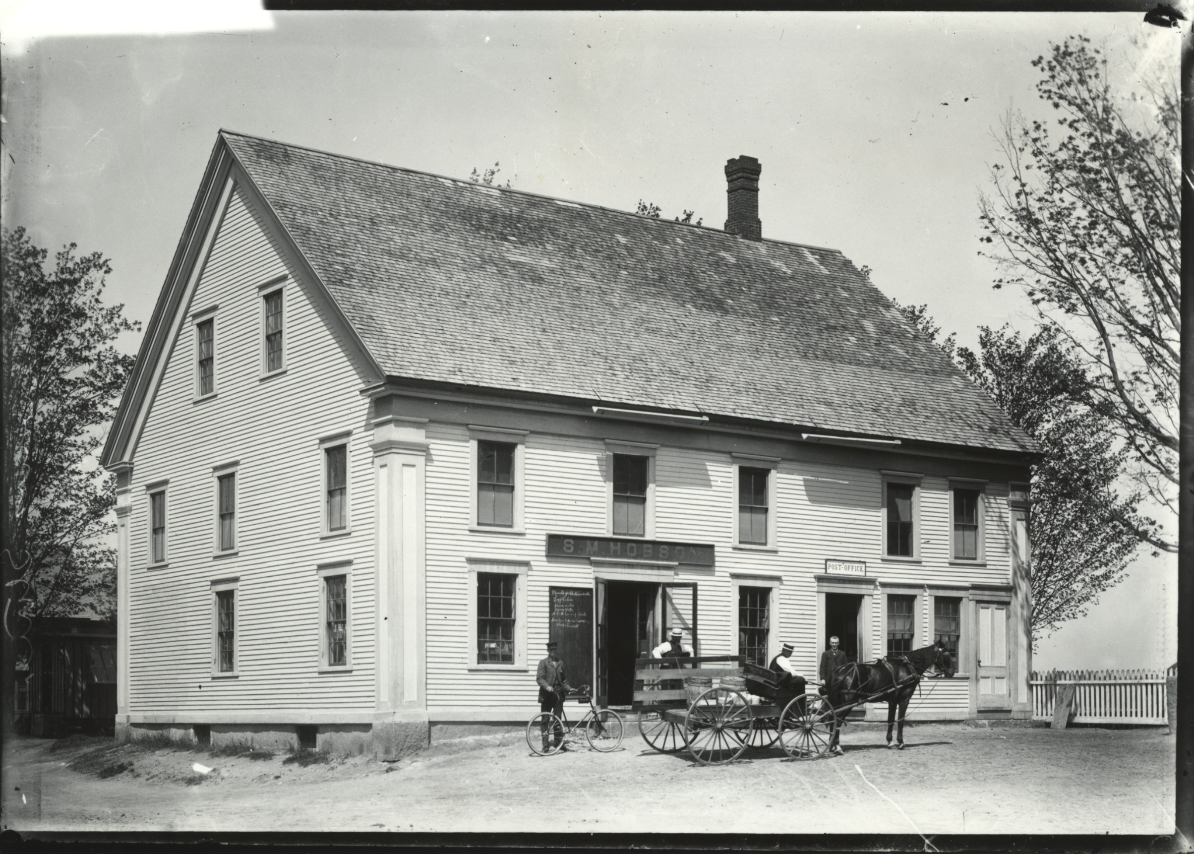 This c. 1900 photo is not believed to be from Wolfeboro. The store sign reads S. M. Hobbson; the right door sign says Post Office.