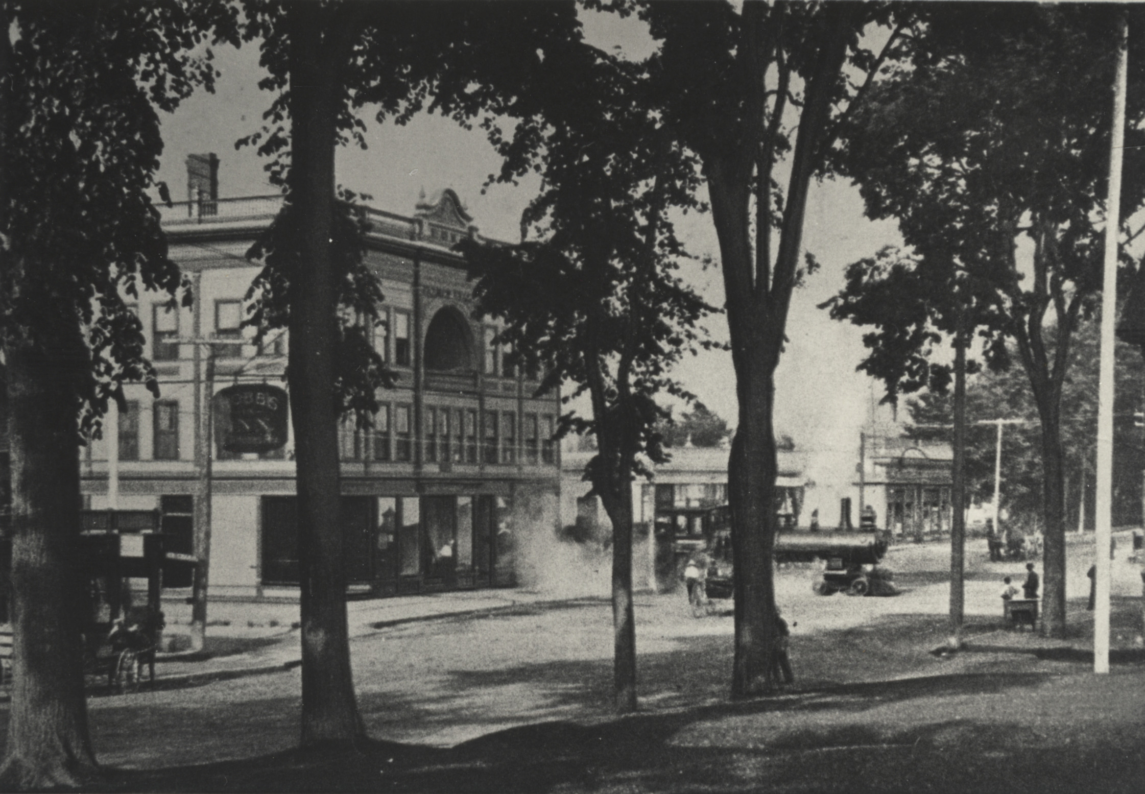South Main St., early 1900's, shows the large Peavey Block (now Avery Block), then the 1-story Goodwin Block (which replaced the original 3-story building that burned down in 1899). A railroad engine is crossing the street, leaving the dockside railroad depot. A sign on the second tree from the left reads "Hobbs-Is-Inn", where the photo was taken. This is now the site of the Post Office.