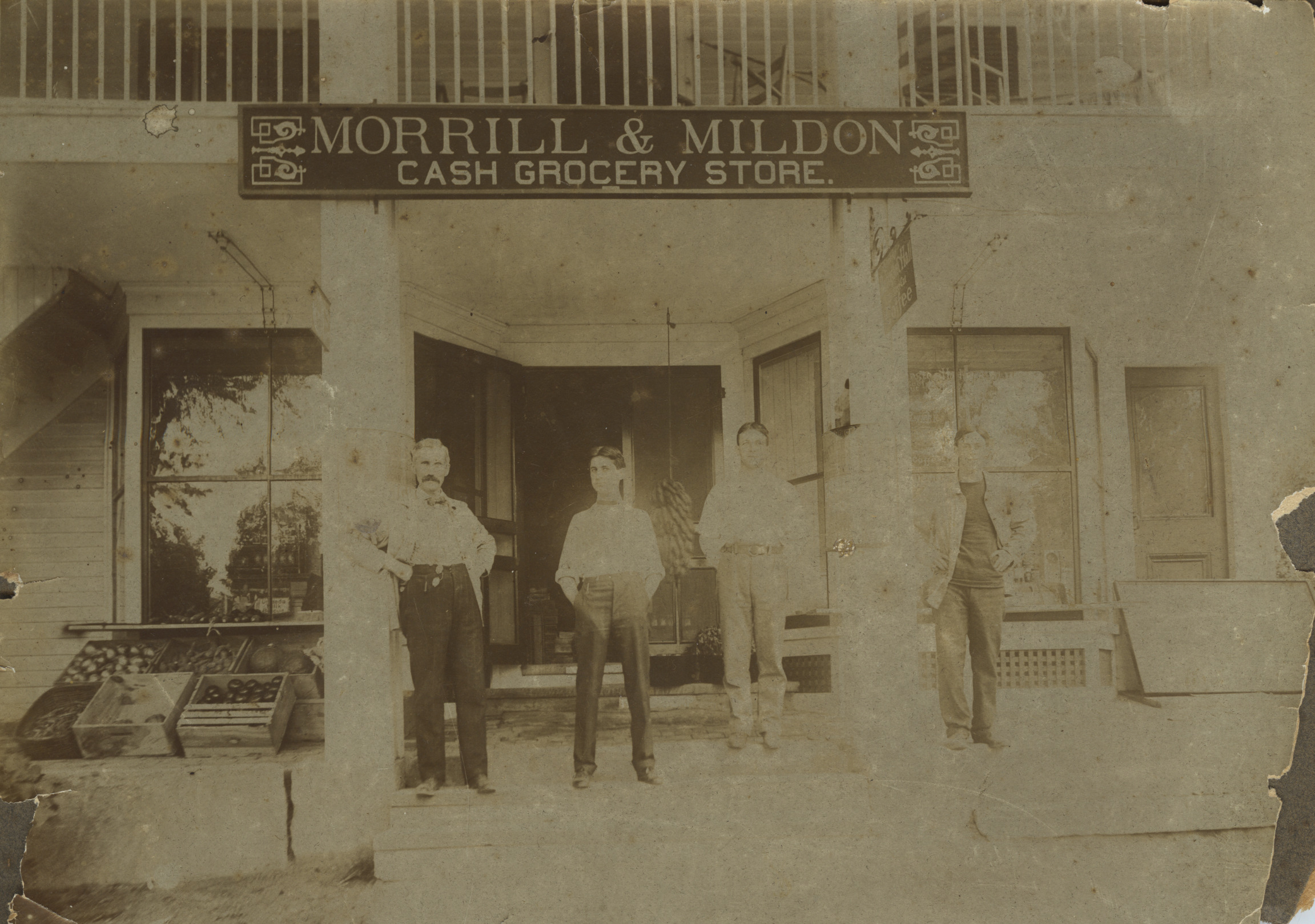 G. H. Morrill & F. W. Mildon came from Maine to open a grocery store in the Scott House. The business was only there from 1904-1906. The location is on South Main St., north side, just down the hill from the corner gas station.