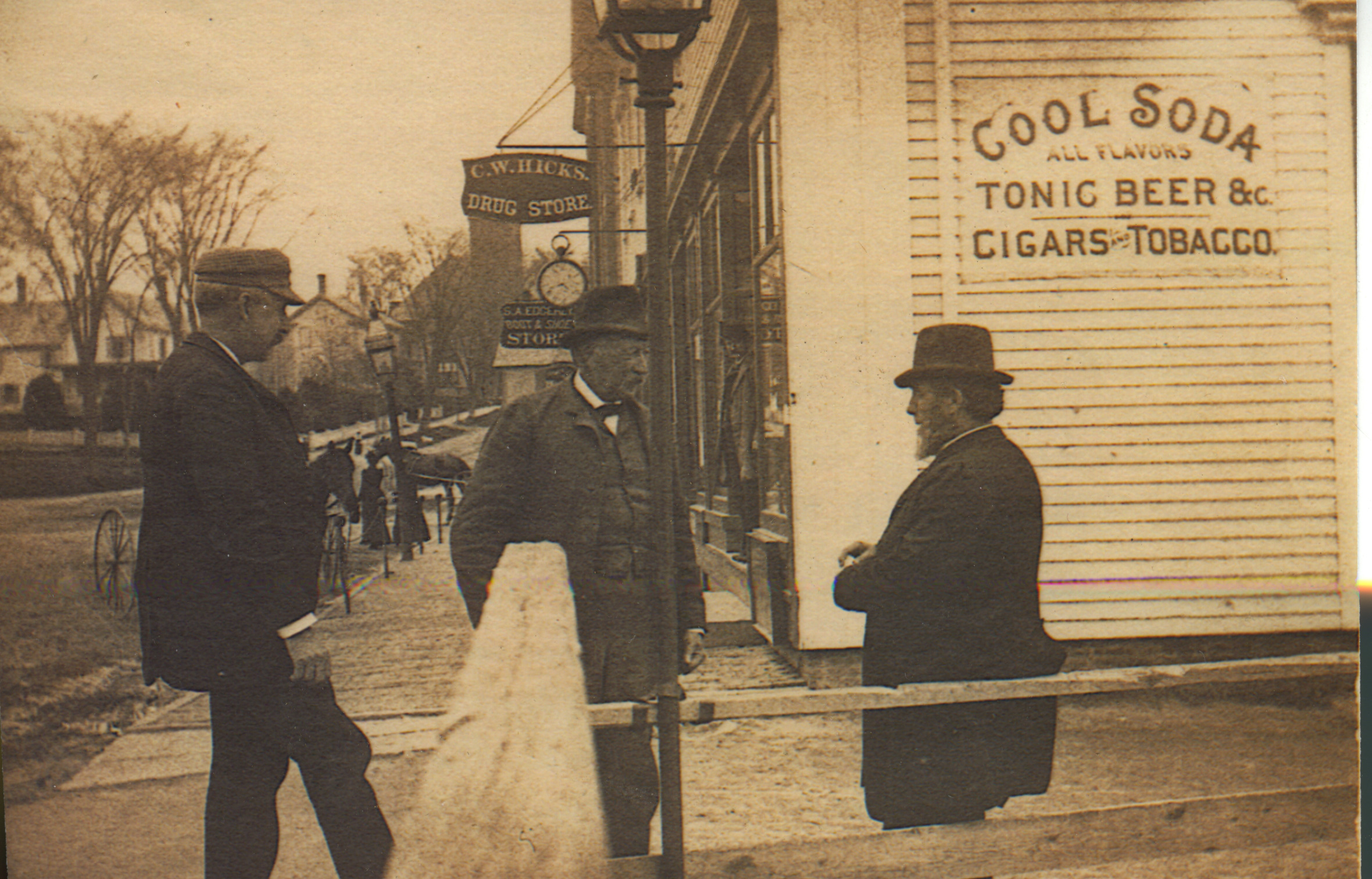 Three men at the downtown bridge looking toward South Main St., c. 1894. The building is the 3-story Goodwin Block, which burned down in 1899. The Charles W. Hicks Drug Store went out of business in 1895. The next store was Sylvester A. Edgerly's Shoe & Boot Store, which was later gutted in the 1899 fire. The tower of Brewster Memorial Hall (Town Hall), built in 1890, is in the background, partially blocked by the store sign.