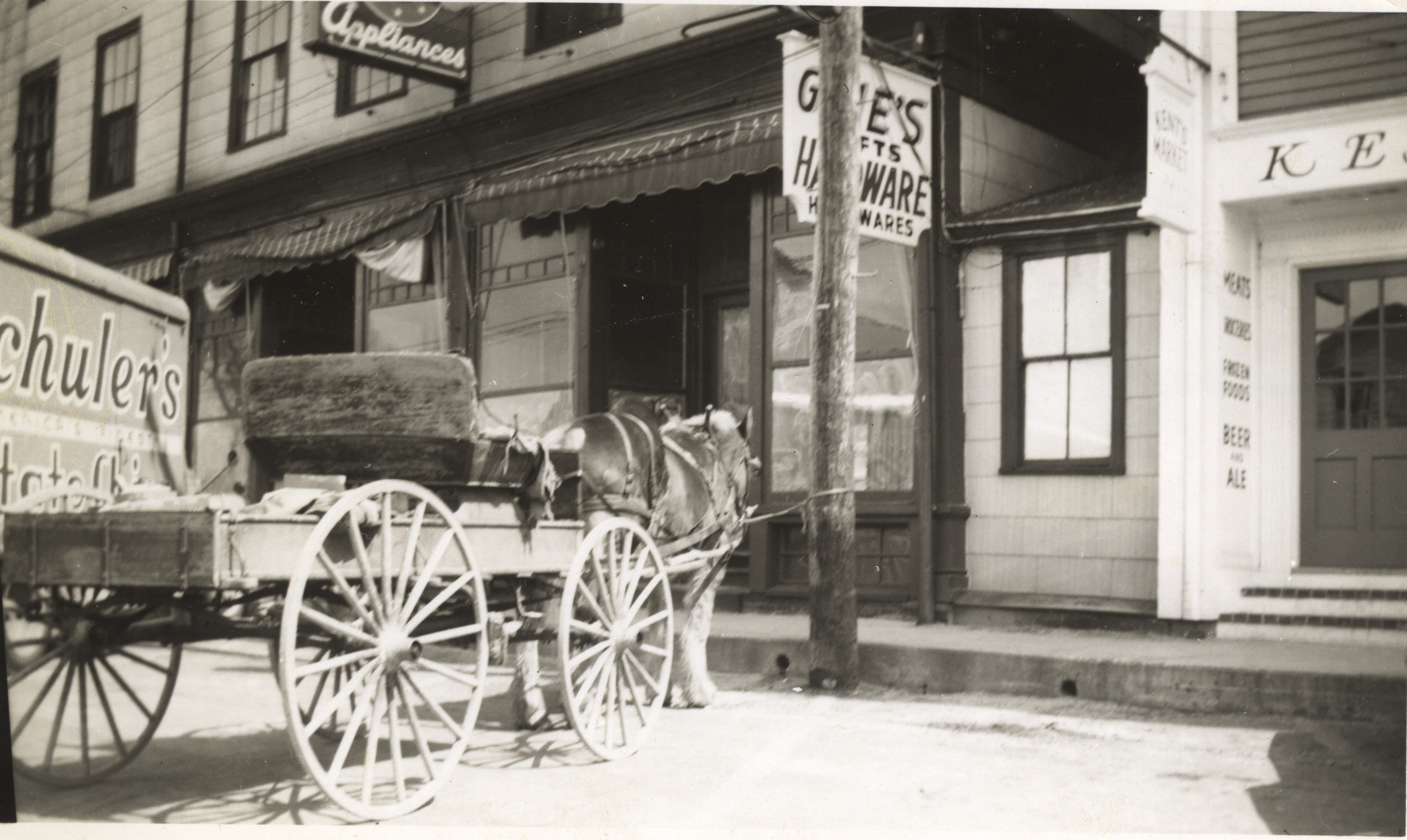This photo is on Railroad Ave. The building on the left was the second building behind the Bank Block and had severe internal damage in a fire on Jan. 1, 1958. The photo dates to April 12, 1958. The store on the right, Kent's Market (meals & groceries) was in the first building behind the Bank Block and was not damaged. The horse and wagon belonged to Grover L. Moody of the Wolfeboro Highlands (a name given to the northwest district of Wolfeboro, also called the Lord's Quarter, when the Town was originally divided). Grover Moody, a WWII veteran, was part of the Moody family that lived in the Pork Hill Rd. area. The names Moody Mt. and Moody Mt. Farm are still used today. It is not known why he brought his team to town at this late date.