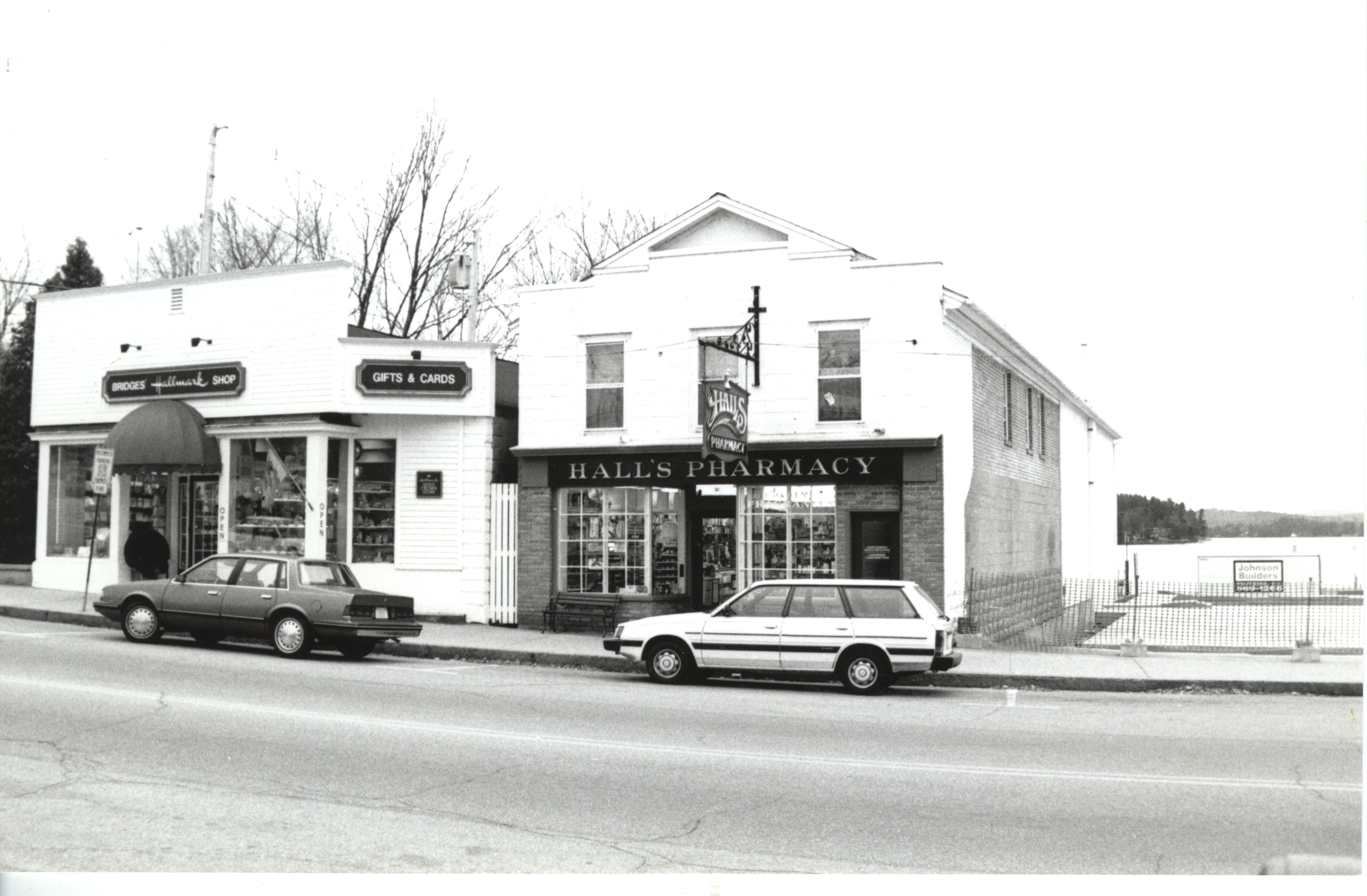 This photo shows the shops on South Main St. across from the Post Office after Sept. 1993. The building that was on the right has been demolished, the site is cleared, and a new 2-story building, known as the Latchaw Building (owner Dr. John Latchaw) was completed in 1994. The ground floor has had numerous tenants since then; the second floor has Jo Green's Restaurant, a long-term tenant.