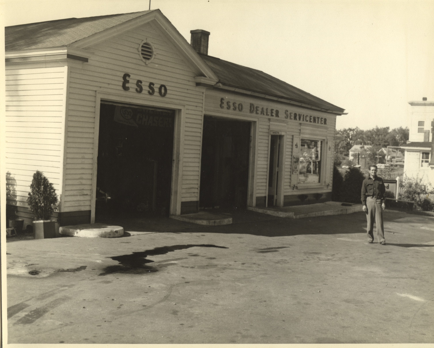 This Esso Gas Station on South Main St. was built in 1941 when the Ann Inn was removed. The Station was there until 1966, when it was torn down, and the site eventually became Town & Cate Parks. The man is Robert Dougal, one of the managers of the station for owner Fred E. Varney. The gas station building was saved and moved to an area off Factory St., near the present Foss Field, and used as a warming hut for an outdoor town skating rink.
