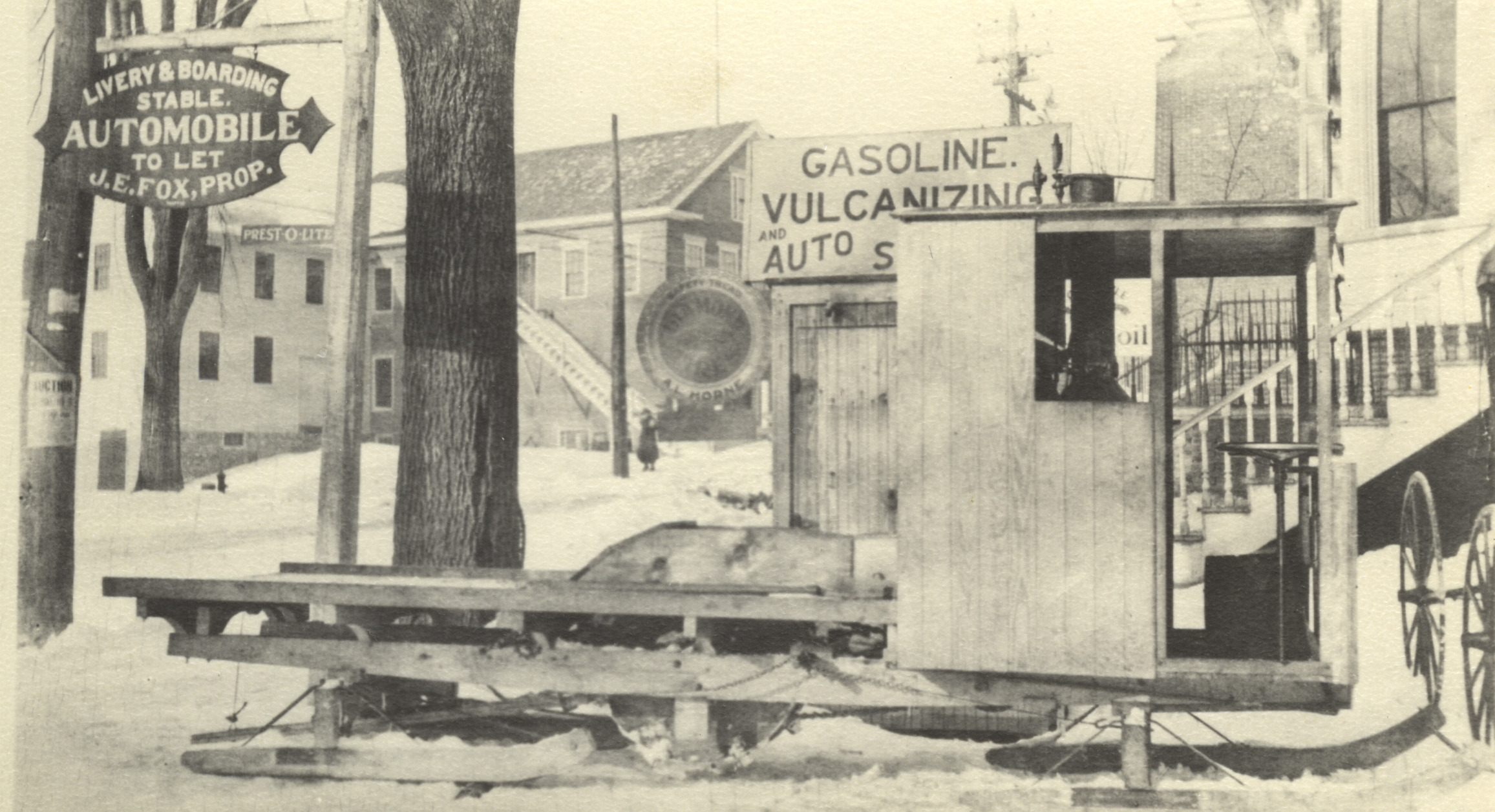 This home-made motorized bob house is gassing up at Horne's Garage on North Main St., c. 1910. The Durgin Block is the building on the right. Fox's Livery Stable, formerly the Durgin Stable, handled both horses and automobiles. The building in the center background is the United Food Stores at the corner of North Main St. & Lake St. Note; photos of this bob house are also in the section Wintertime - Activities on Ice.