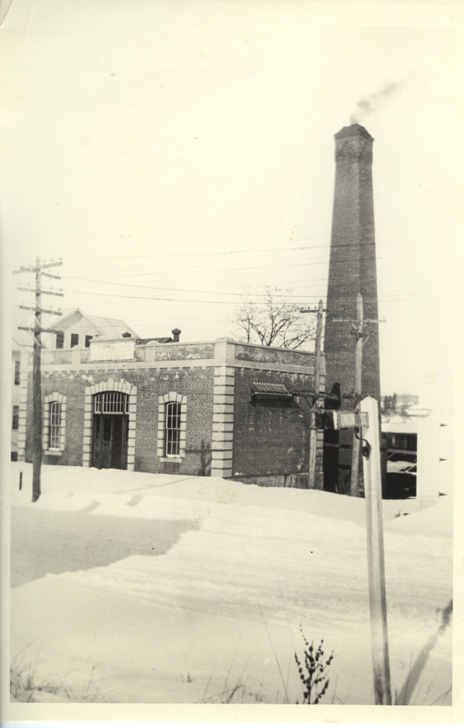 Municipal Power Plant on Factory Street (now Lehner St.), 1897. This was a steam-operated generator. Documents say power came from the Libbey and Varney Co. sawmill nearby, but are not specific. It is assumed this means steam was provided, but needs further research. The chimney in back belonged to the first shoe factory, which was built in 1884, then burned down in 1887.