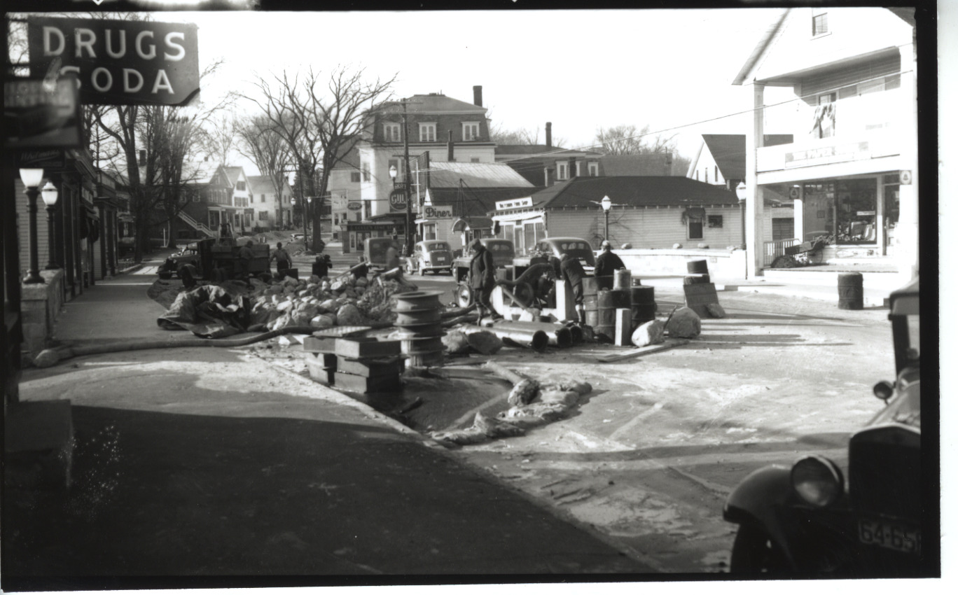 View from across the street from the Wool Corner, looking toward North Main Street. This is believed to be crews working on the Town's first sewage system in the late 1930's.