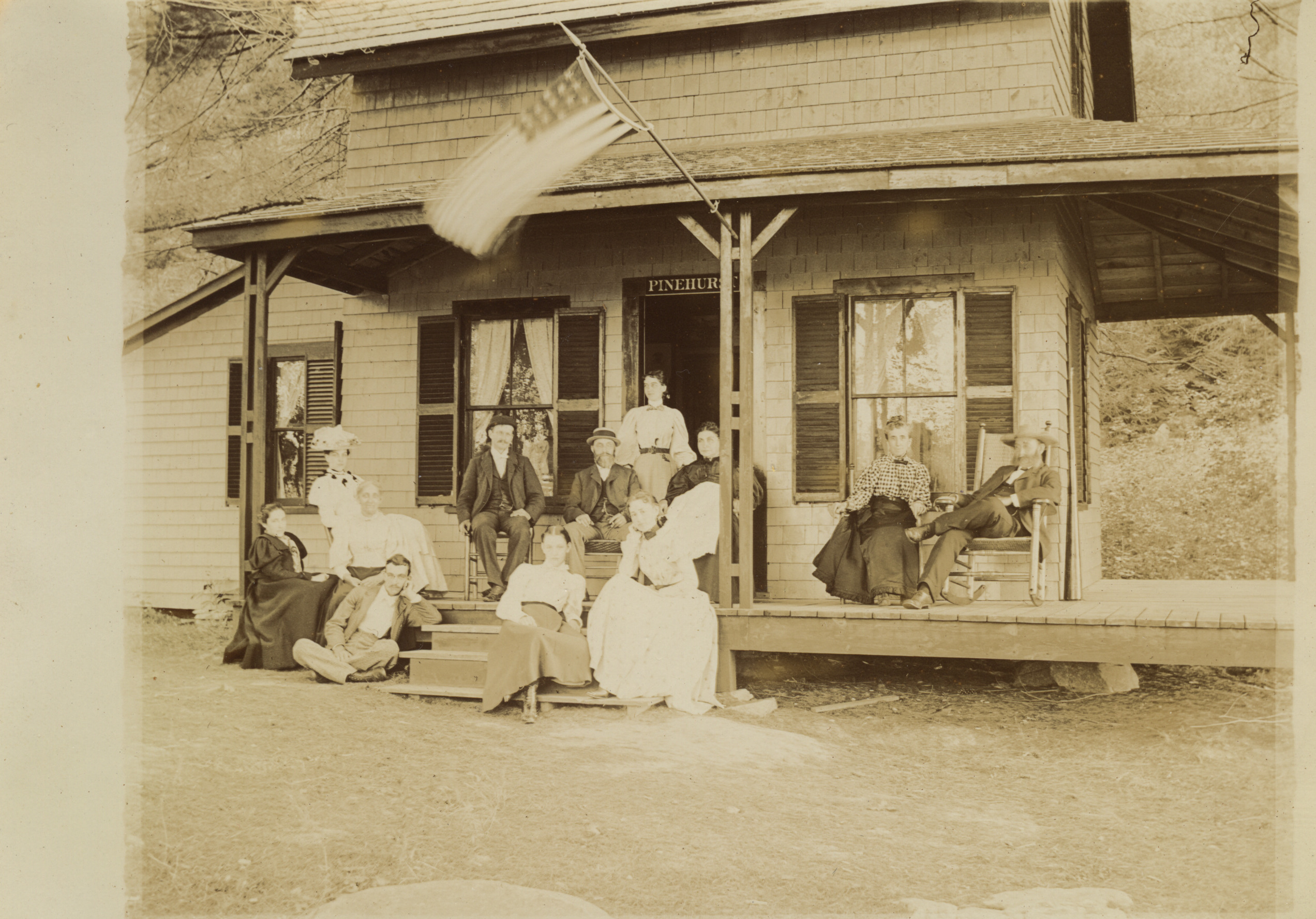 Fred E. Meader camp "Pinehurst" at Point Maryland. Left are May Holmes & Harry Meader on steps, Mabel Davis above. Right are Emily & George Meader. Others include Marie, Samuel & Eleanor Meader & 3 unknowns, but positions are unclear.