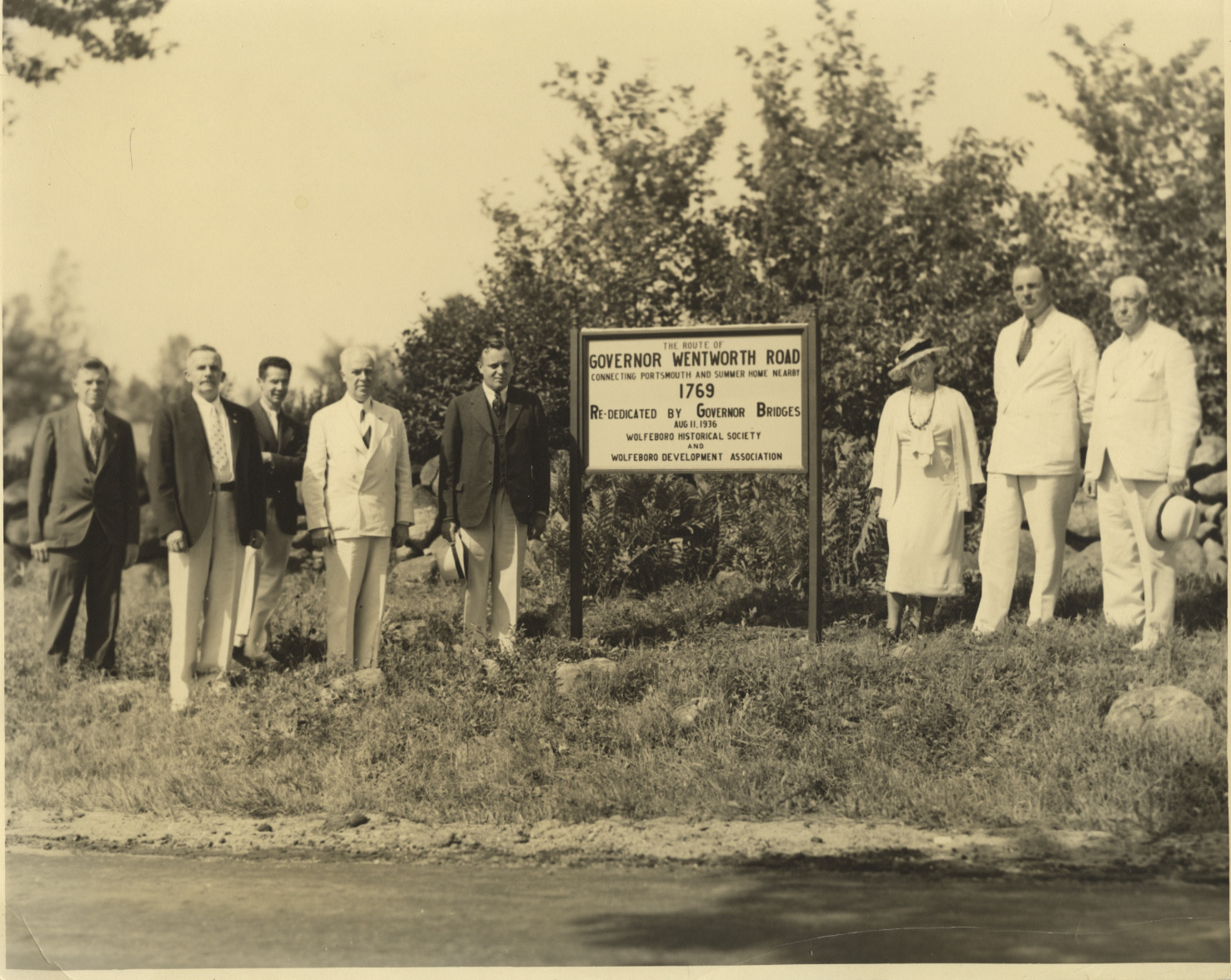 Rededication Ceremony of the Governor Wentworth Road, Aug. 11, 1936. L-R, Fred Stackpole, Maj. Leigh Harvey, (Old Home Week chairman), Robert Merritt, Harold Hart (local automobile dealer), Gov. H. Styles Bridges, Josephine Rust (who unveiled the marker), Jasper Palmer (who planned the marker), and Dr. Frederick E. Meader. Within a few months, the sign was shot apart by an unknown vandal. Governor John Wentworth was well-liked and progressive. The road was later extended to Dartmouth College. If not for the Revolution, his mansion could have become the Governor's Palace, and Wolfeboro the Capitol, of the Province of New Hampshire.