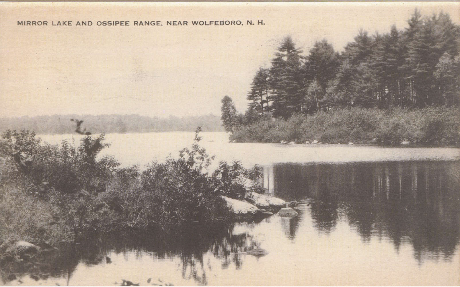 This view of Mirror Lake and the Ossipee Range was taken from the lot which the Libby Museum is on. Photo was taken in 1936.