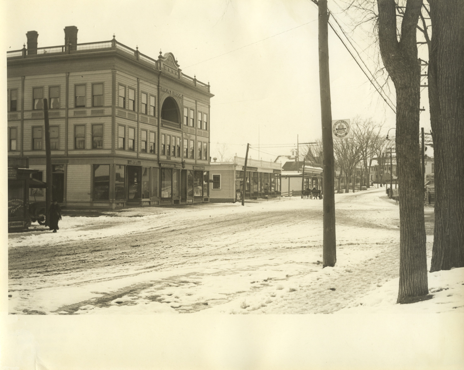 Downtown from site of today's Post Office, looking toward North Main St. Building on left is the Peavey Block, now Avery Block. Taken Feb. 7, 1916.